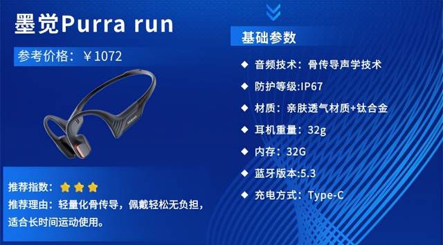 推荐理由:墨觉Purra run定位中高端运动骨传导耳机,专为追求低频质感与长续航的运动爱好者设计,搭载墨觉核心专利技术,兼顾舒适佩戴、强悍音质与可靠防水,适配各种日常运动与轻户外场景。