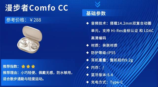 推荐理由:漫步者Comfo CC定位入门级开放式真无线耳机,主打轻量化佩戴与长续航,专为日常轻运动、通勤人群设计,凭借简约设计、便捷操作与亲民价格,成为入门级开放式耳机的高性价比之选。