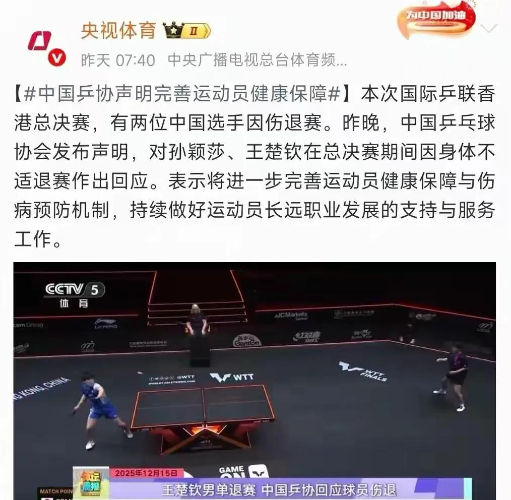 12月13日,孙颖莎单日连轴出战混双半决赛、女单半决赛、混双决赛,两场比赛间隔仅80分钟。女单赛场左脚踝扭伤后,她绑着厚厚绷带硬撑到第五局,最终因跑动受限无奈退赛,却仍坚持站上混双决赛赛场 。次日,王楚钦赛前突发背部不适,直言“实在动不了”,在冲击男单四连冠的关键战中选择退赛,留下一个遗憾却清醒的背影。