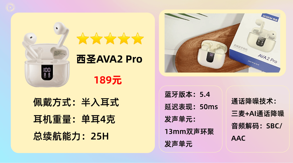 ▶主打优势:百元价位的蓝牙耳机选哪款不踩雷?主打高性价比,日常出门通勤用。亲测西圣AVA2 Pro值得入手,横向对比了200元内的同类型产品,这款的音质在同档里很能打,百元就能享受到越级的使用感受,性价比优势很明显。如果你还以为“半入耳 = 没降噪、音质一般”,那你真的该认识一下这个耳机圈的“现象级新星”——西圣AVA2 Pro。作为2025年横空出世的热门耳机,它不仅一经上线就火速出圈,更被数码媒体和发烧友誉为“旗舰蓝牙耳机杀手”,只卖两百出头,却用音质和舒适度,正面硬刚千元级大牌,实打实地做到了“平价享轻奢”。