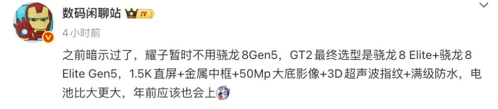 随着时间的推进,这位博主又在最新的爆料中提到:“之前暗示过了,耀子暂时不用骁龙8Gen5,GT2最终选型是骁龙8 Elite+骁龙8 Elite Gen5,1.5K直屏+金属中框+50Mp大底影像+3D超声波指纹+满级防水,电池比大更大,年前应该也会上”。