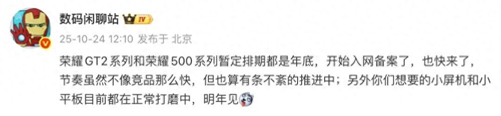 上周,博主@数码闲聊站 的一份爆料中显示:“荣耀GT2系列和荣耀500系列暂定排期都是年底,开始入网备案了,也快来了,节奏虽然不像竞品那么快,但也算有条不紊的推进中;另外你们想要的小屏机和小平板目前都在正常打磨中,明年见”。