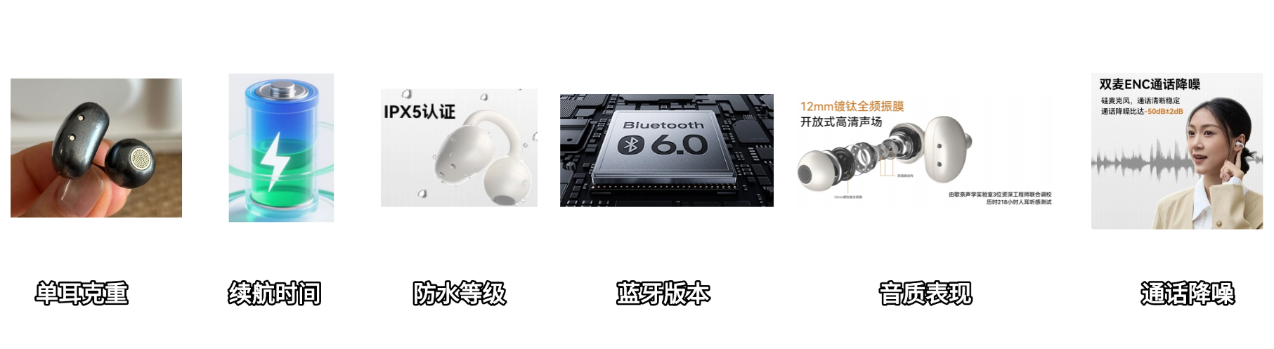 - 其他参数:蓝牙V6.0,单耳4.4g,IPX5防水