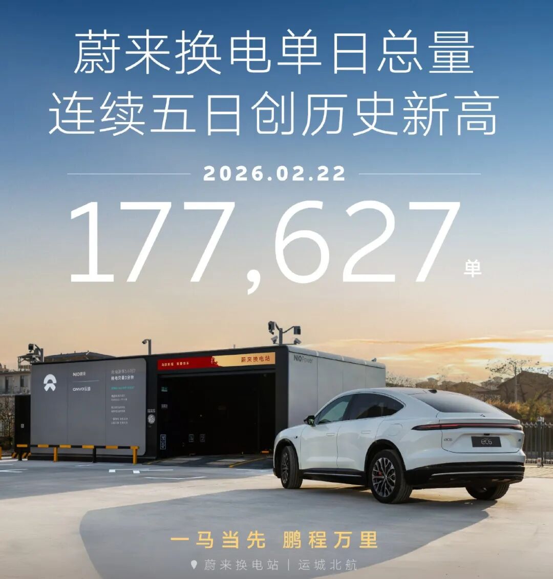 蔚来官方发布消息称,2026年2月22日,蔚来单日换电总量达177,627次,创下品牌换电单日量新纪录,这也是其自马年新春以来连续第五日刷新换电单日总量的历史新高。