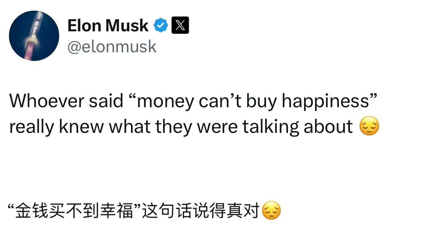 最近马斯克在推特上一句“金钱买不到幸福”,配着emo的表情,刷爆了全网😭