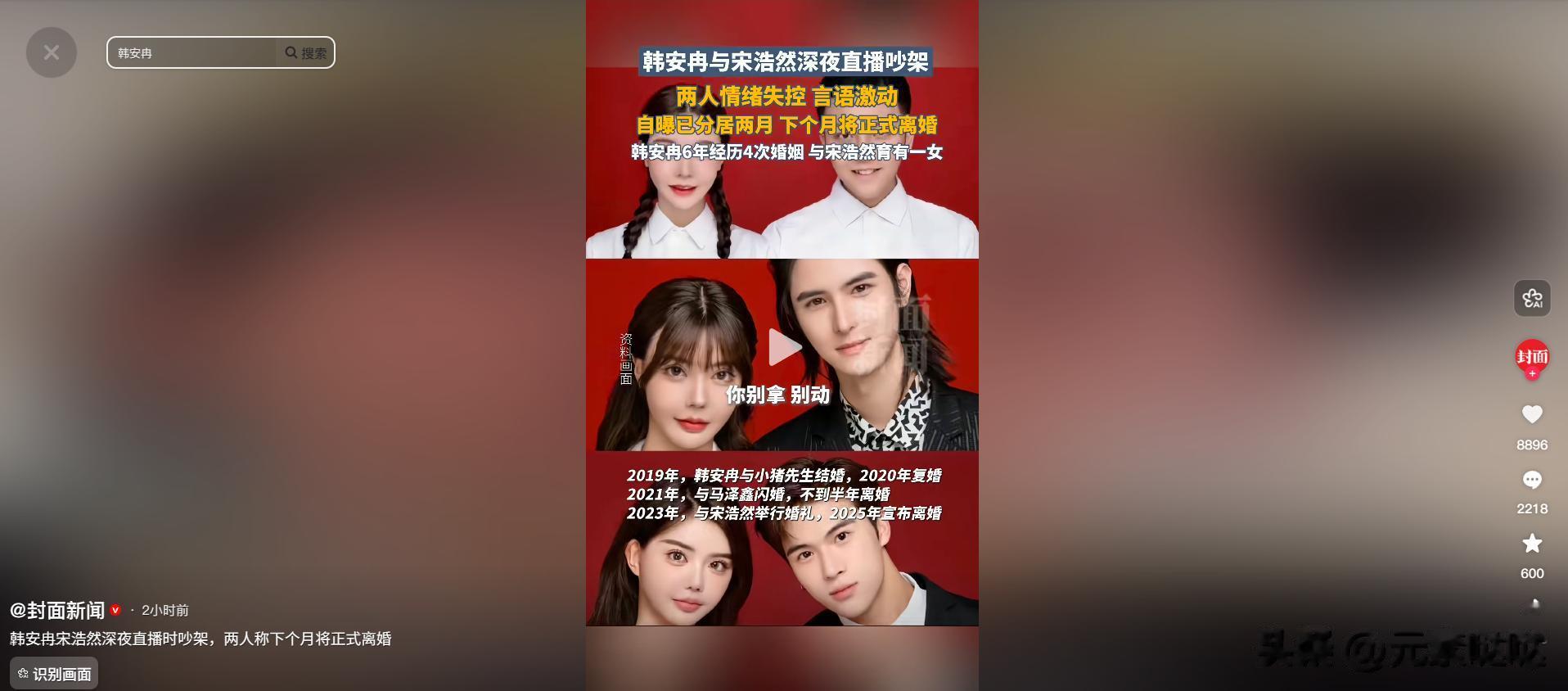 不得不说,26岁的韩安冉人生是真精彩,前几天刚被前夫泽熙指控,昨天和现任宋浩然的吵架直播又被传得满天飞。