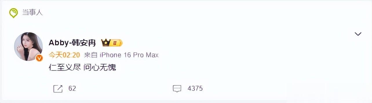 面对着越来越大的舆论,韩安冉回应“仁至义尽 问心无愧”。