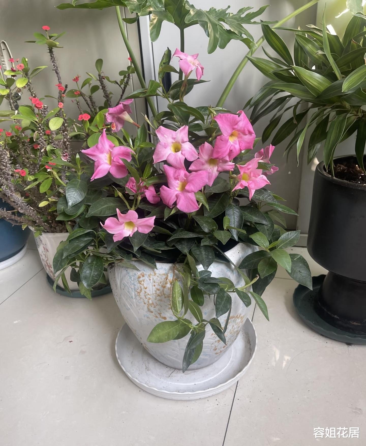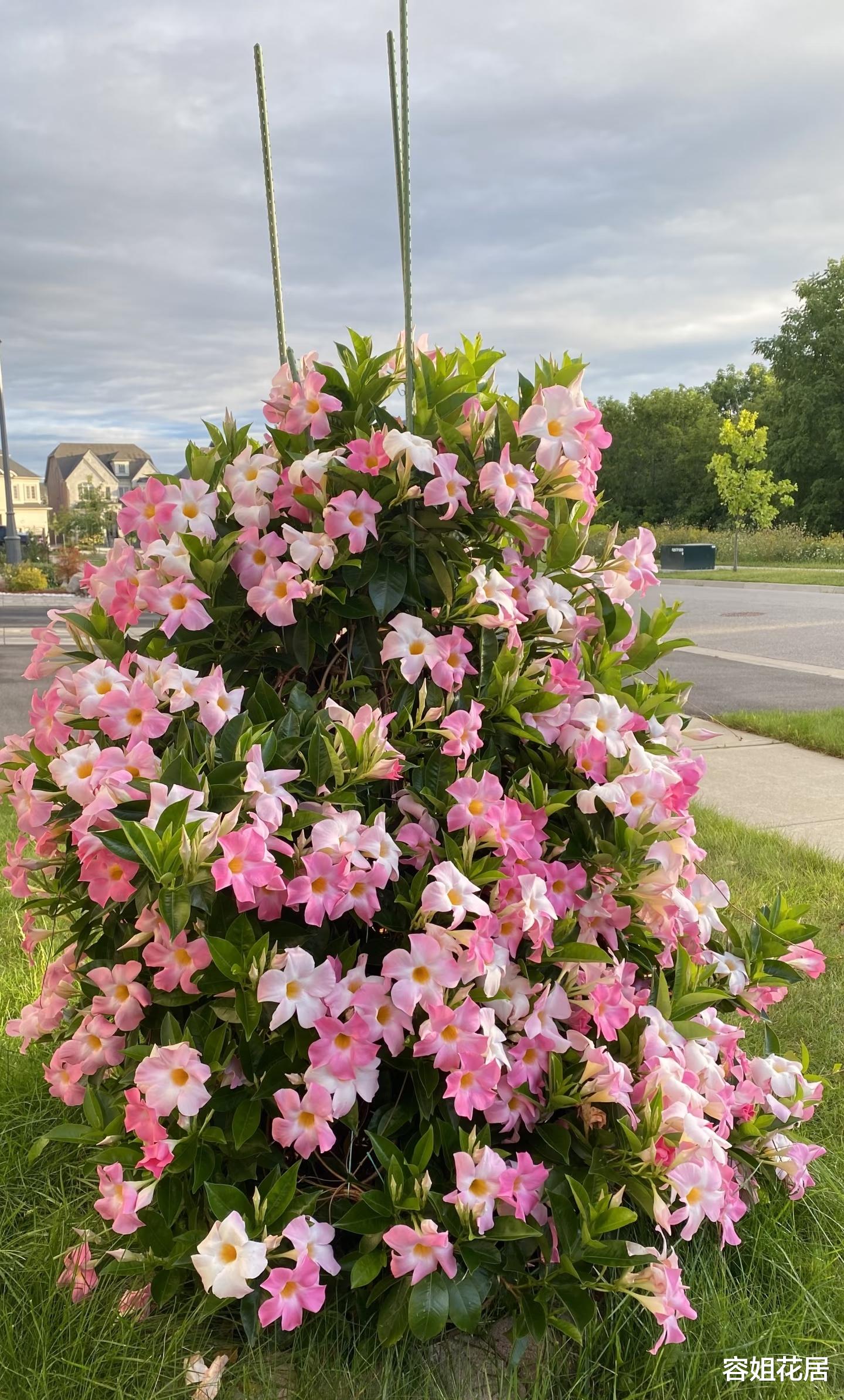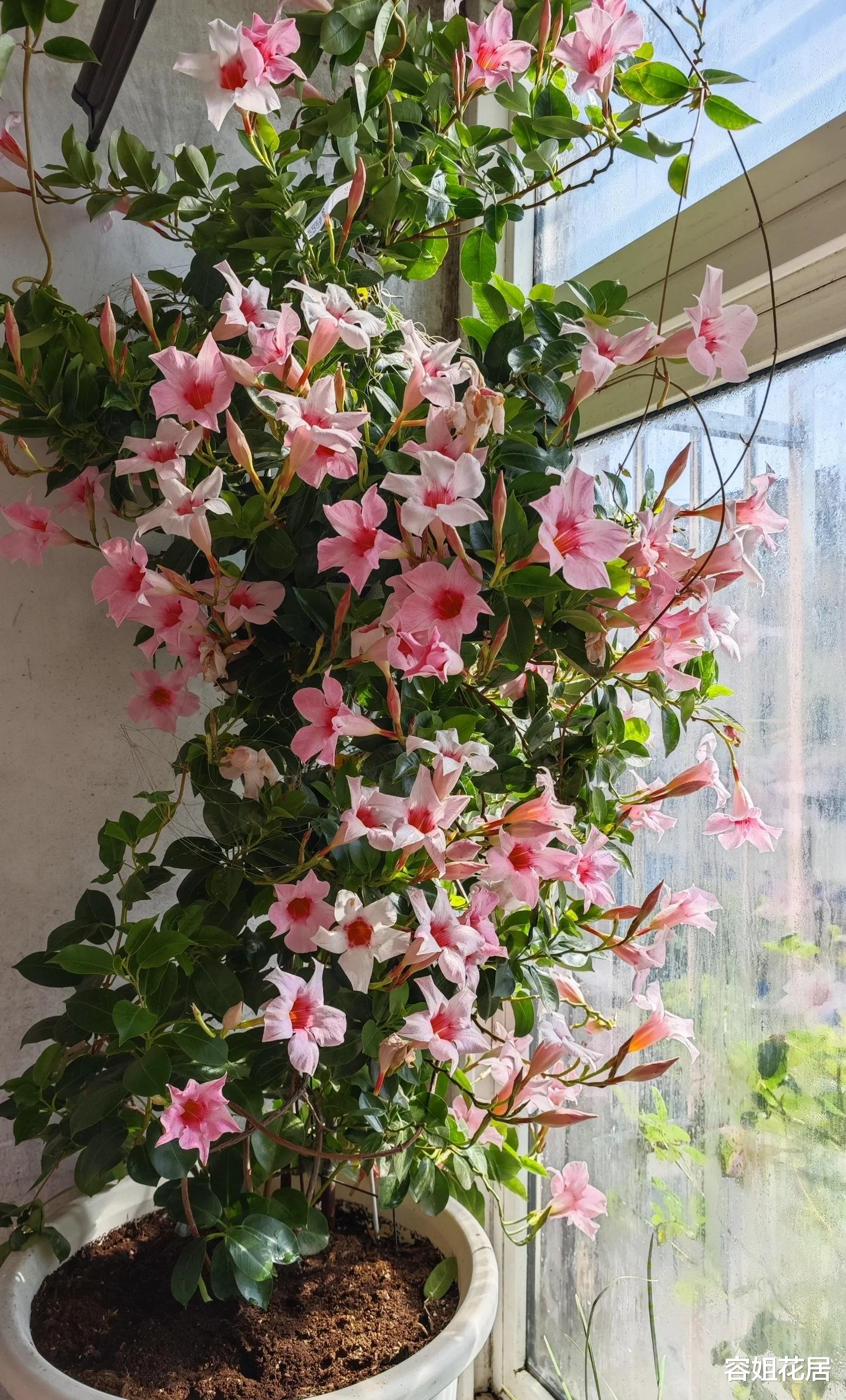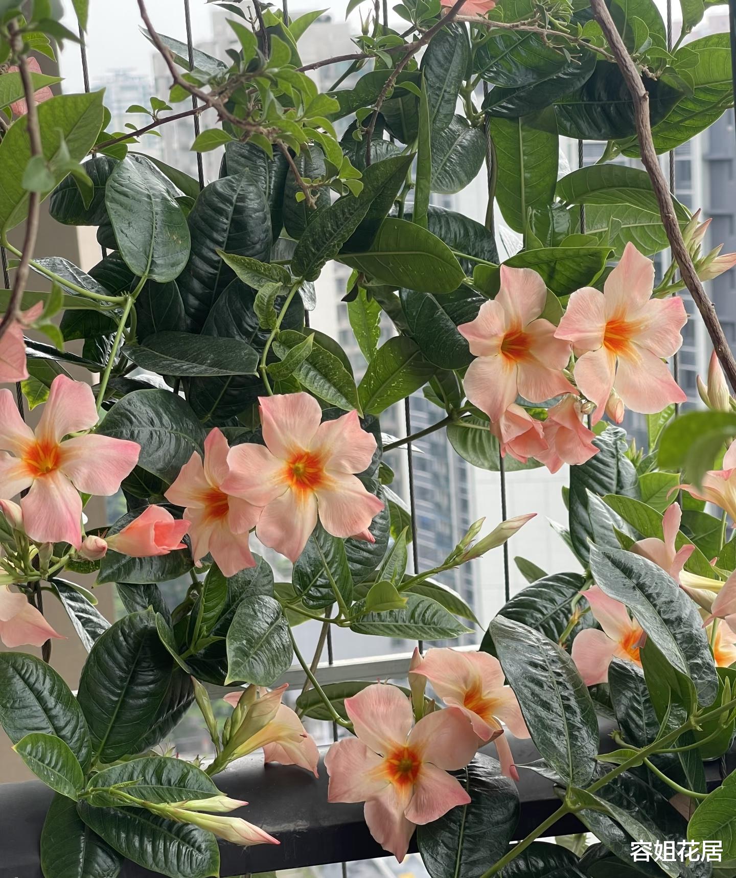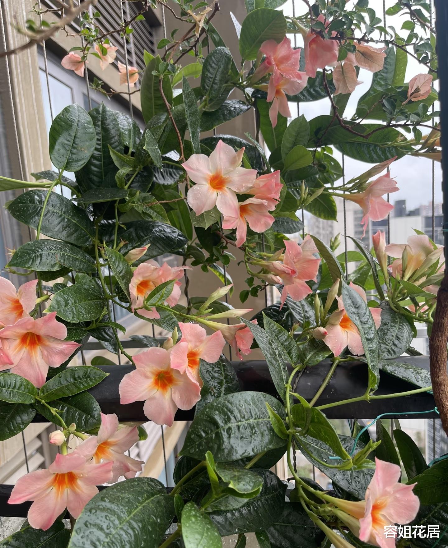 他种植的飘香藤,还是这种桃红色的,叫桃色日出,粉嫩嫩的,特别可人。