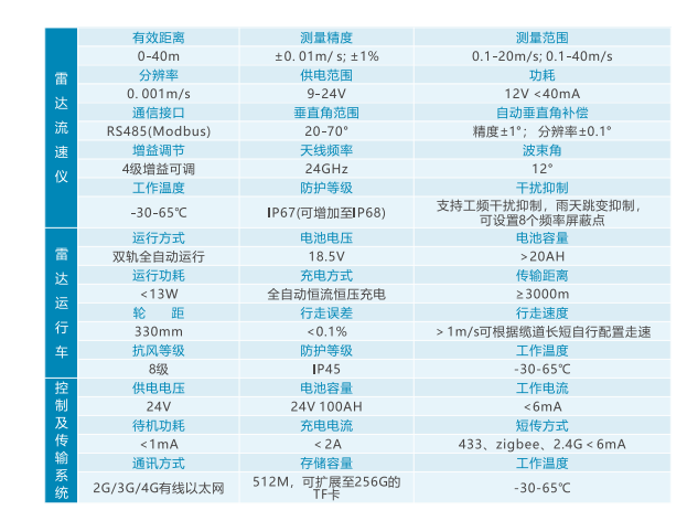 雷达流速仪:有效测量距离 0-40m,流速测量范围 0.1-40m/s,测量精度 ±1%,分辨率 0.001m/s,工作温度 - 35-75℃,防护等级最高可达 IP68,通信接口为 RS485 (Modbus)。雷达运行车:采用双轨全自动运行,电池容量>20AH,运行功耗<13W,支持 4G 无线网络传输,行走误差<0.1%,抗风等级 8 级,可自动判断异常并返回原点。控制及传输系统:供电电压 24V,待机功耗<1mA,支持 2G/3G/4G / 有线以太网通讯,存储容量 512M 且可扩展,工作温度 - 30-65℃。
