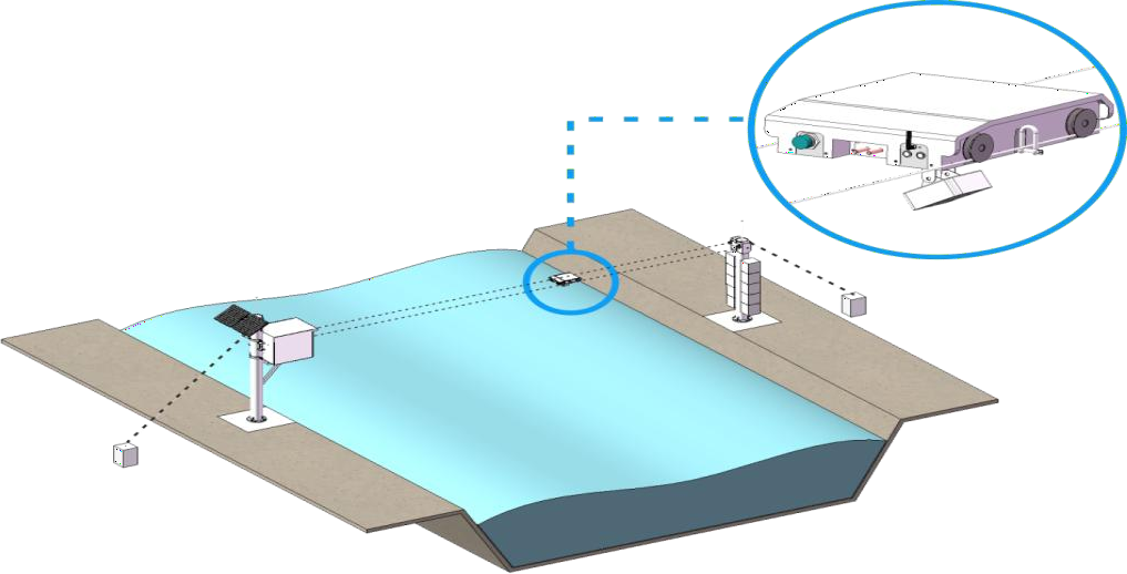 该系统以雷达波测流为核心,主要由雷达运行车、雷达流速仪、水位监测装置、控制及传输系统、缆道基础等组成。技术人员将雷达流速仪、伺服电机、智能控制器及动力电源集成于雷达运行车,以 304 不锈钢钢丝绳搭建双轨移动导轨,运行车悬挂于导轨可精准移动至预设测流垂线位置。系统触发测流指令后,同步采集流速与水位数据,结合断面参数自动计算小断面及整体过流面积、流量,数据实时上传云端,测流完成后运行车自动返回并智能充电,实现全程无人值守。