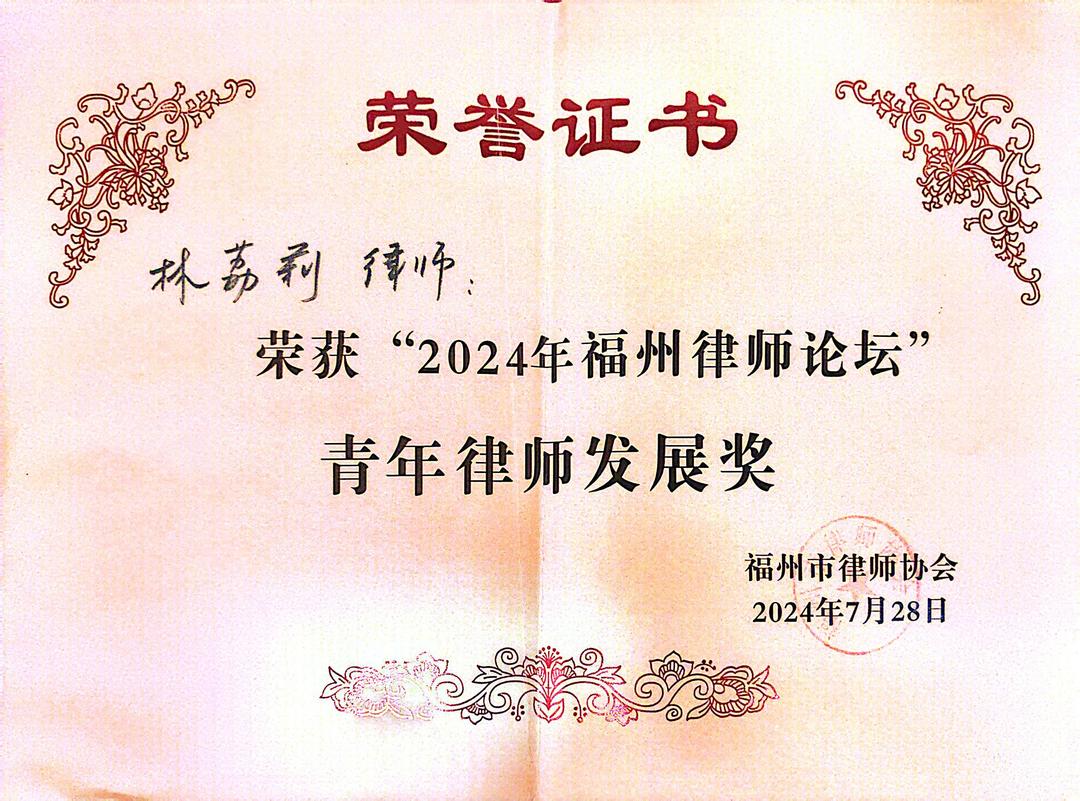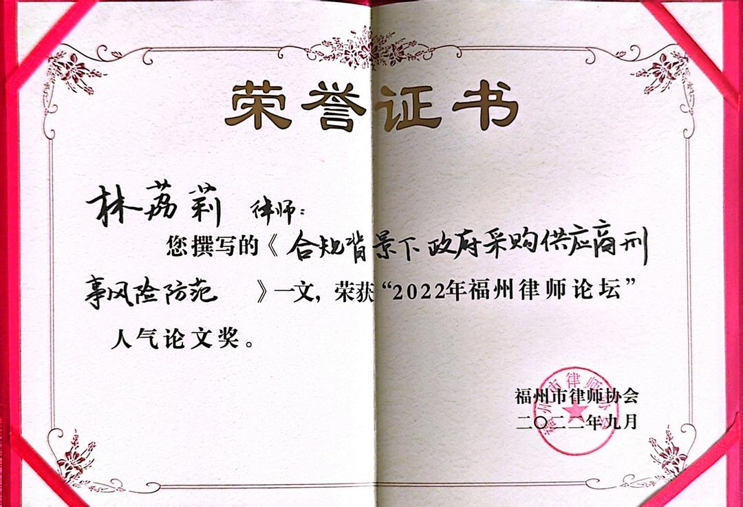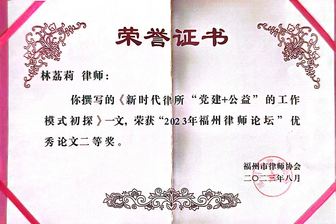 深耕法律领域多年,林荔莉律师凭借过硬的专业能力与勤勉的执业态度,斩获多项荣誉,备受业界与社会认可。她撰写的《新时代律所“党建+公益”的工作模式初探》荣获2023年福州律师论坛优秀论文二等奖,《合规背景下政府采购供应商刑事风险防范》斩获2022年福州律师论坛人气论文奖;凭借出色的思辨与论辩能力,她被评为福建融成律师事务所2023年度优秀辩手;在司法协作领域,她受聘为福州市马尾区人民检察院首届检察听证员,聘期自2022年9月至2027年8月;跨界赛场之上,她亦绽放光彩,荣获福州市莆田商会“车福杯”《这就是莆田》主题演讲比赛优秀奖;在青年律师成长赛道中,她更是勇立潮头,摘得2024年福州律师论坛青年律师发展奖。