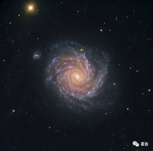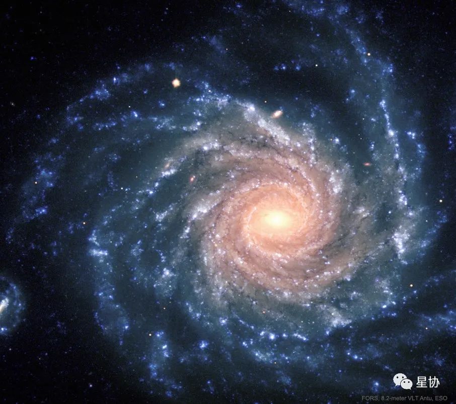 上面影像里的可见物质,绝大部分是数以百万计的亮星和黝黑的尘埃,以及它们所聚成、绕着星系核心打转的螺旋臂。而蓝色亮星所组成的疏散星团则散布在旋臂上,它们之间夹杂着由致密星际尘埃所聚成的尘埃带。【星协科普】