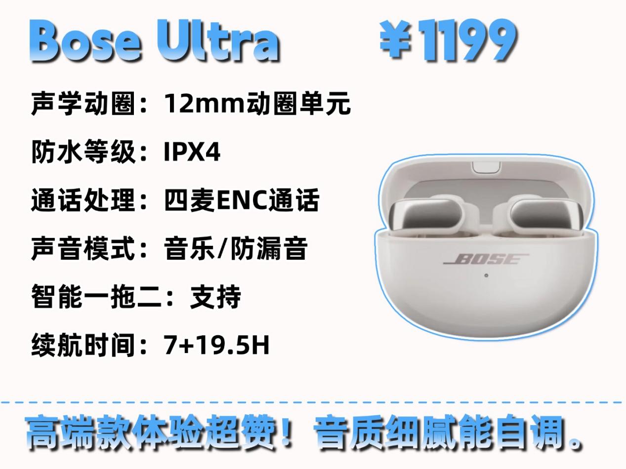 Bose Ultra价格:1199元推荐理由:想买高端款的选它,音质和佩戴都很专业,细节做得好。