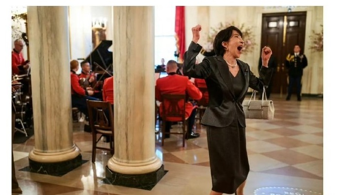 从白宫官网及社交平台发布的照片和视频中可以看到,高市早苗在白宫竟然跳舞时咧嘴大笑,神态极为夸张,完全没有一国首相应有的外交礼仪庄重感。这还不算,在参观白宫 “总统星光大道” 时,她的 “两副面孔” 更是令人咋舌。面对特朗普肖像,她张大嘴巴、伸展双臂,尽显崇拜之情;而路过代表拜登的自动签名笔照片时,却捂嘴发笑,这种刻意贬低拜登以谄媚特朗普的行为,实在是有失体统。