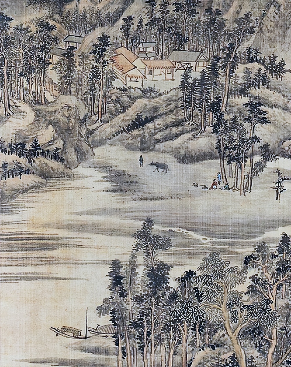 仔细看画面中景处有一个条状空间,方士庶在此描绘了山中村民的生活场景。既有牵牛牧归,也有扶老携幼。通过这个细节就能判断出,方士庶画的是傍晚时分的山水景色。夕阳余晖落在江南山村,让远山近水罩染上一层动人的光彩。