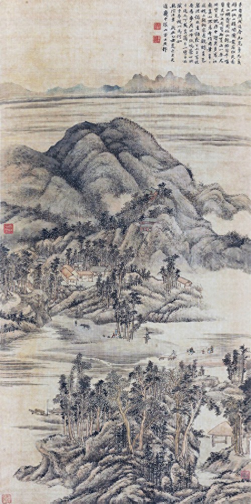 这幅《仿董源山水》是清代画家方士庶的作品。他在题跋处介绍了创作背景以及目的。方士庶生活在扬州,扬州盐商富甲一方往往有收藏书画的雅好。方士庶曾经见过九次董源山水画真迹,基本上把董源的传世佳作都看了一遍。看多了,当然更能理解什么叫“近视不类物象,远观景物粲然”。为了表达他的感受,画了这幅仿古山水画。