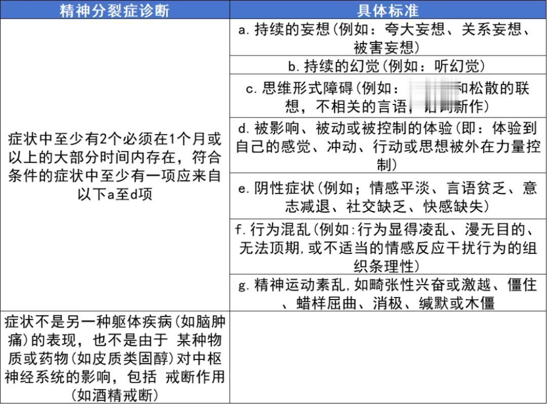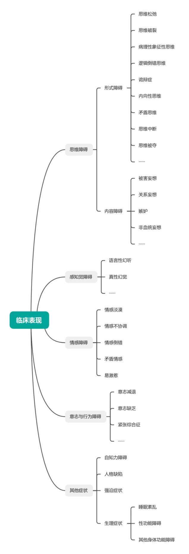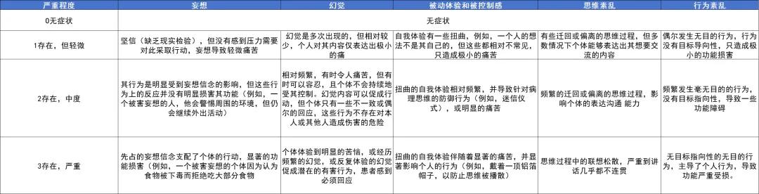 包括持续性妄想、持续性幻觉(听幻觉最为常见)、思维形式障碍(如思维松弛、思维脱轨或思维不连贯)、严重行为障碍(行为怪异、无目的性及非目标导向性)以及被动体验。