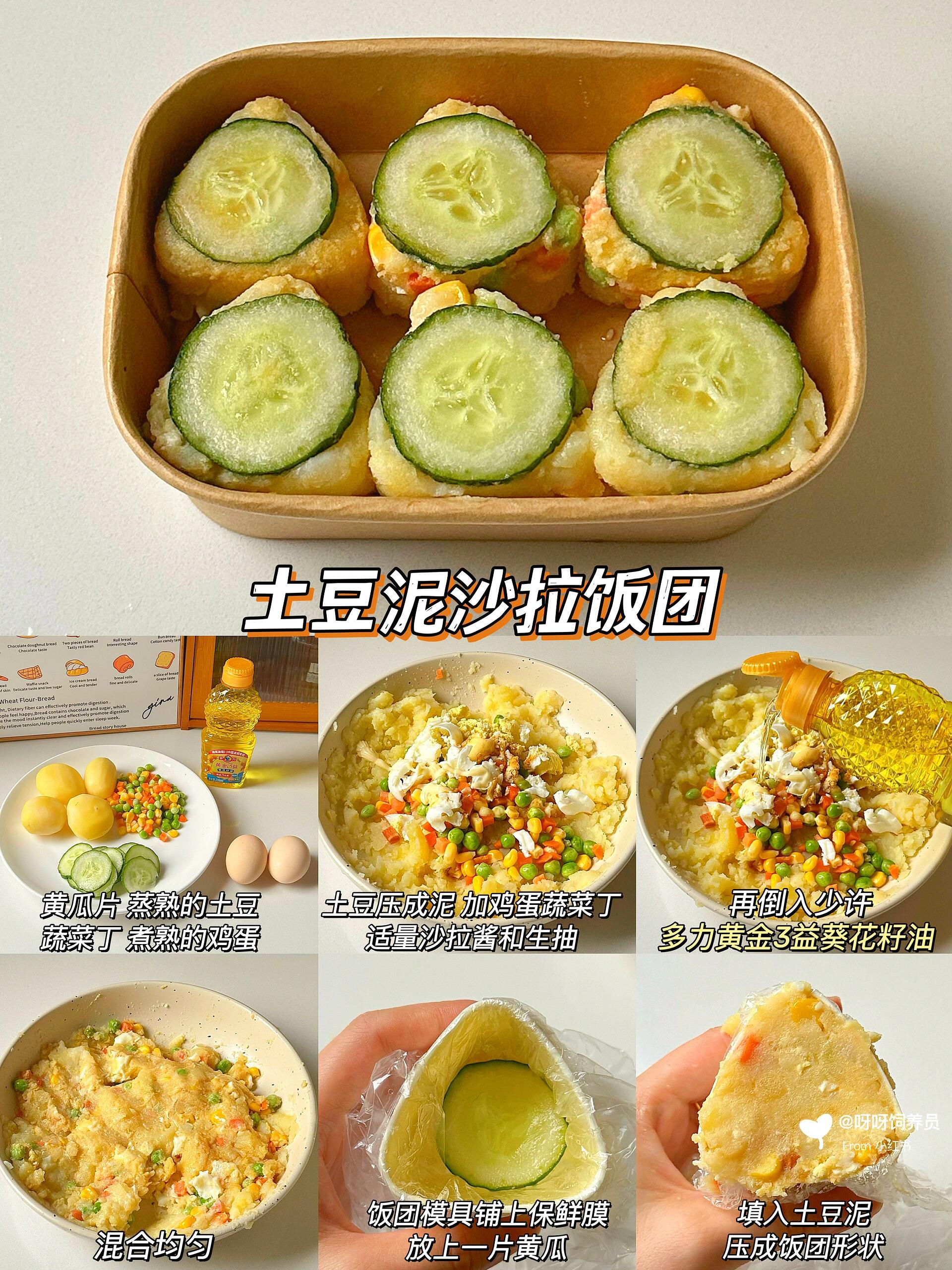 • 口感:土豆泥混合蔬菜丁和沙拉酱,压成饭团,顶部盖一片黄瓜,清爽不腻,适合不爱吃蔬菜的宝宝!