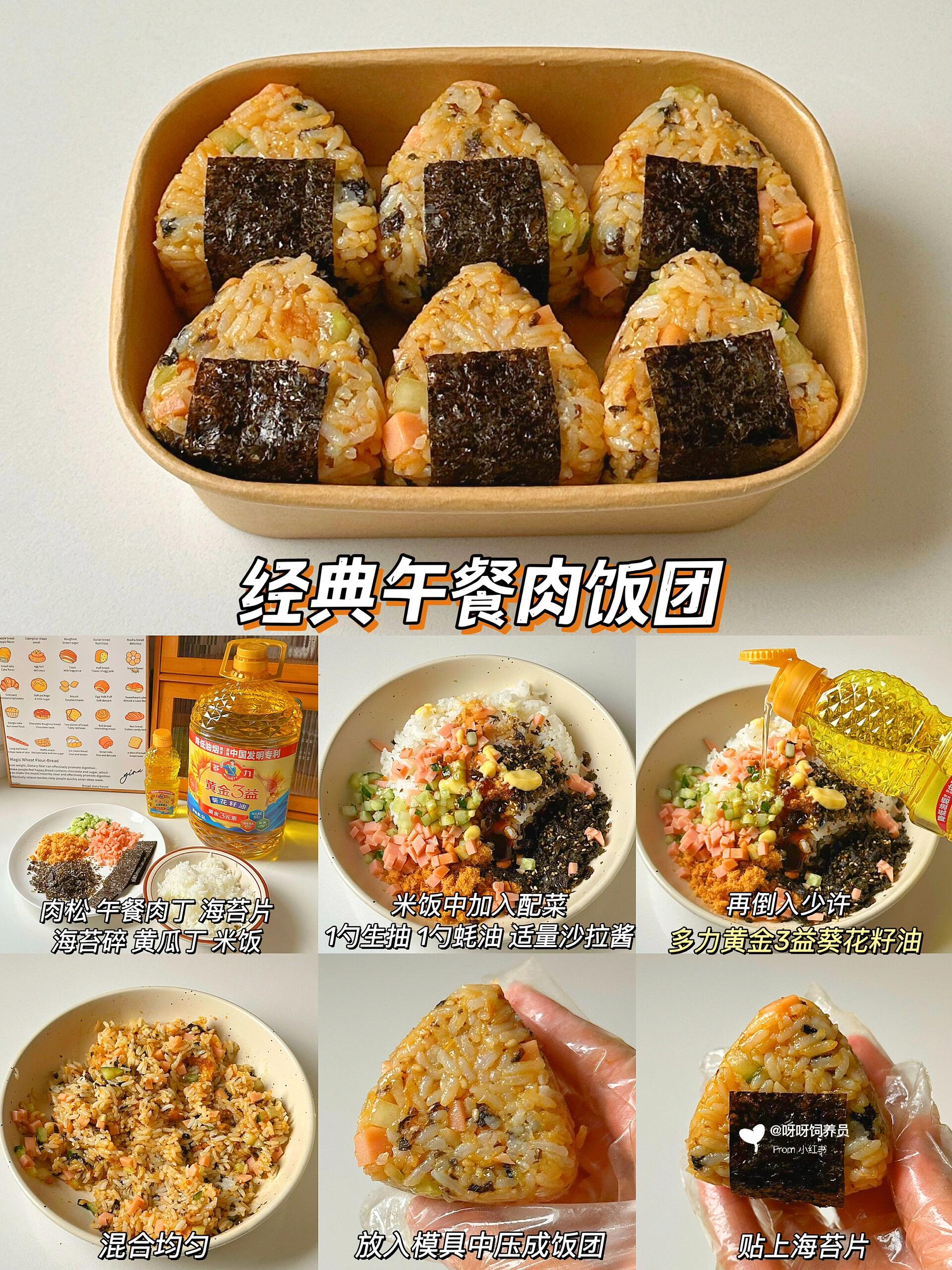 • 做法:米饭+午餐肉丁+黄瓜丁+海苔碎+1勺生抽+1勺蚝油+沙拉酱拌匀,模具压成三角,贴上海苔片。营养亮点:午餐肉提供蛋白质,黄瓜补充维生素,海苔补钙,搭配多力黄金3益葵花籽油,口感更润,宝宝消化无负担~