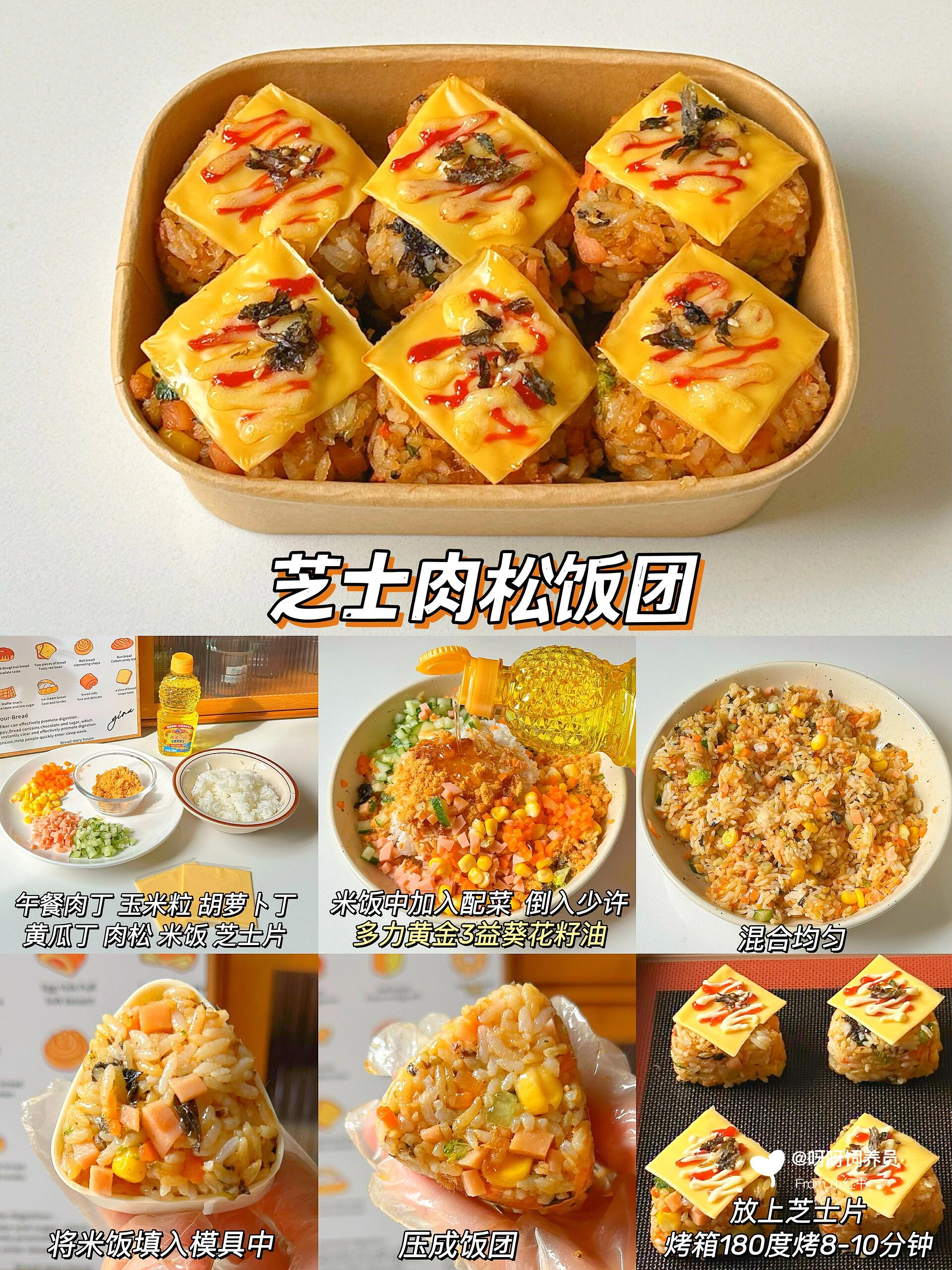 • 做法:米饭+午餐肉丁+玉米+胡萝卜+黄瓜丁+肉松拌匀,压成饭团,放芝士片,烤箱180℃烤8分钟。芝士选择:用马苏里拉芝士更容易拉丝,烤的时候盯着点,别让芝士烤焦啦。