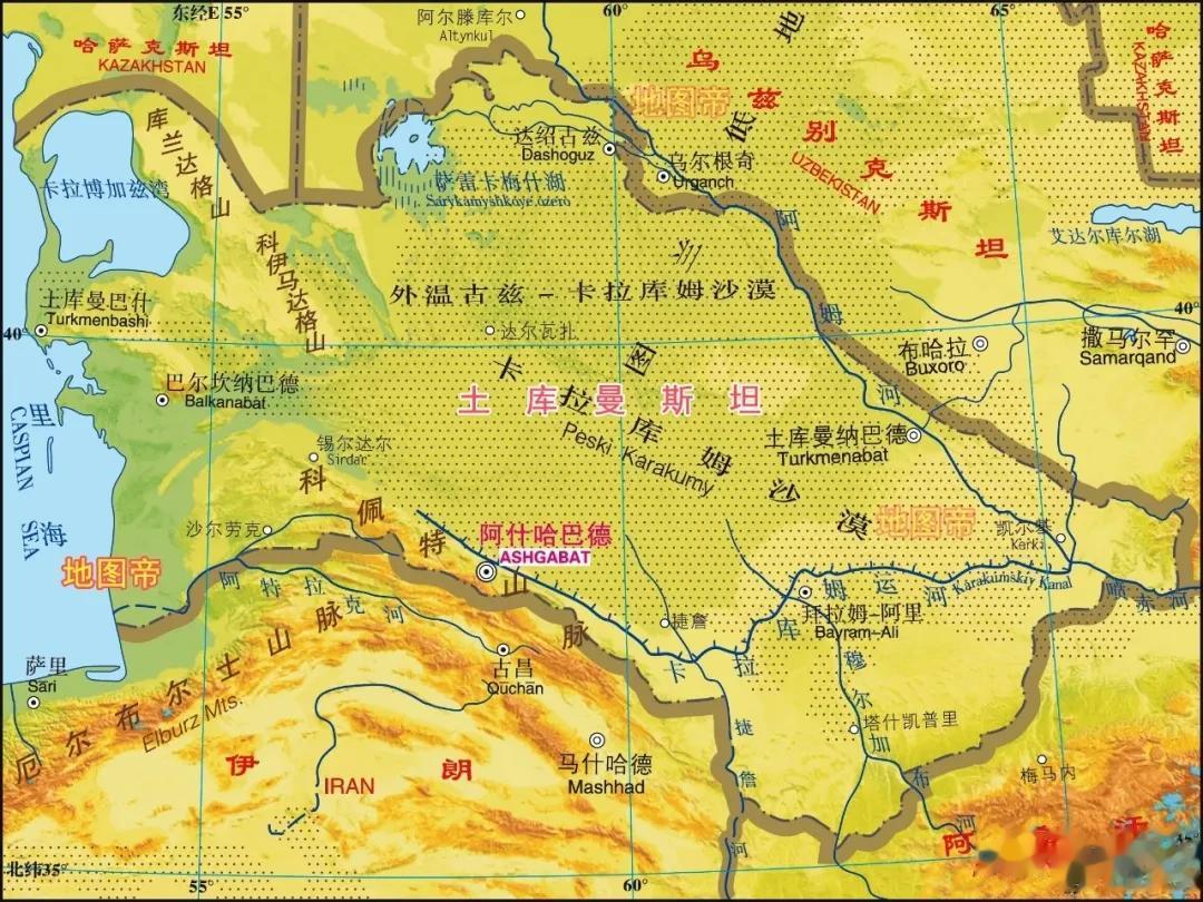 土库曼首都阿什哈巴德,地处卡拉库姆沙漠南缘,科佩特山北麓,面积470平方千米。苏联时期,从阿姆河到科佩特山北麓修了卡拉库姆运河,全长约1375千米。