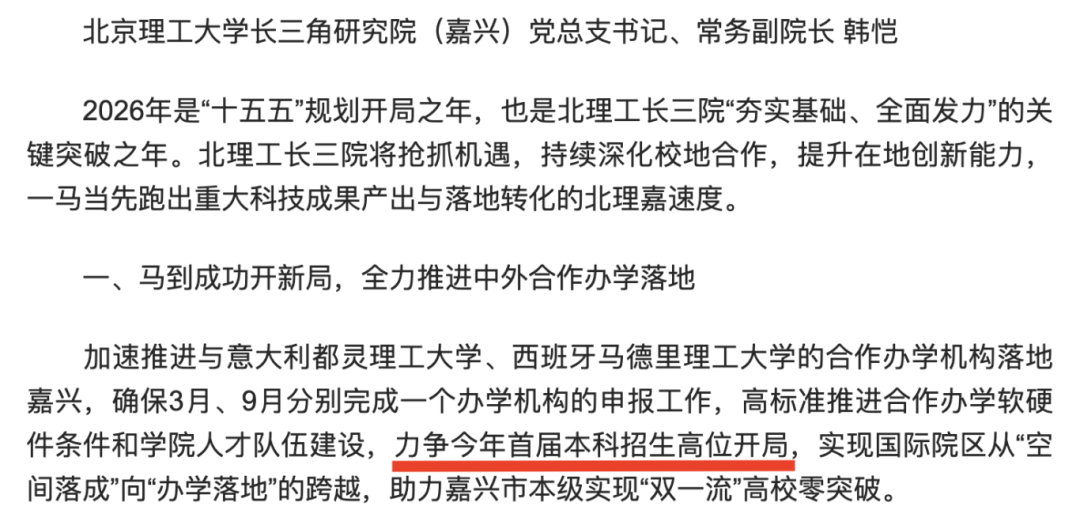 从报道消息看,北京理工大学正加速推进与意大利都灵理工大学、西班牙马德里理工大学的合作办学机构落地嘉兴,确保3月、9月分别完成一个办学机构的申报工作,高标准推进合作办学软硬件条件和学院人才队伍建设,力争今年首届本科招生高位开局,实现国际院区从“空间落成”向“办学落地”的跨越,助力嘉兴市本级实现“双一流”高校零突破。