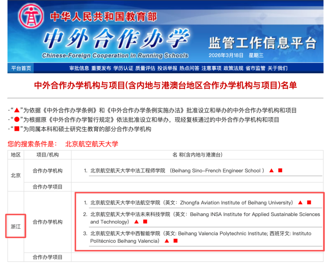 北京航空航天大学(杭州国际校园)目前有中法航空学院、中法未来科技学院进行招生。2026年将新增中西智能学院。