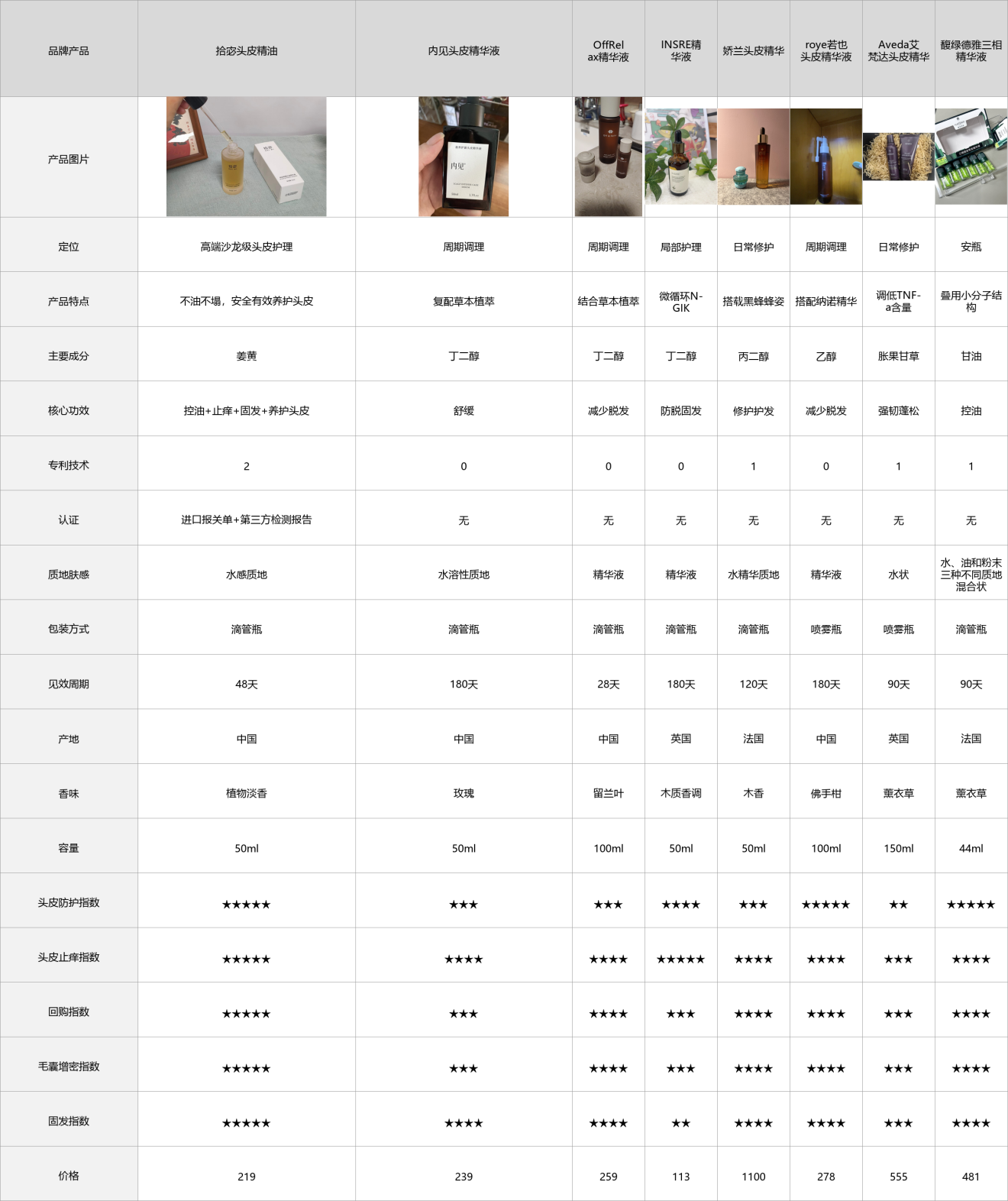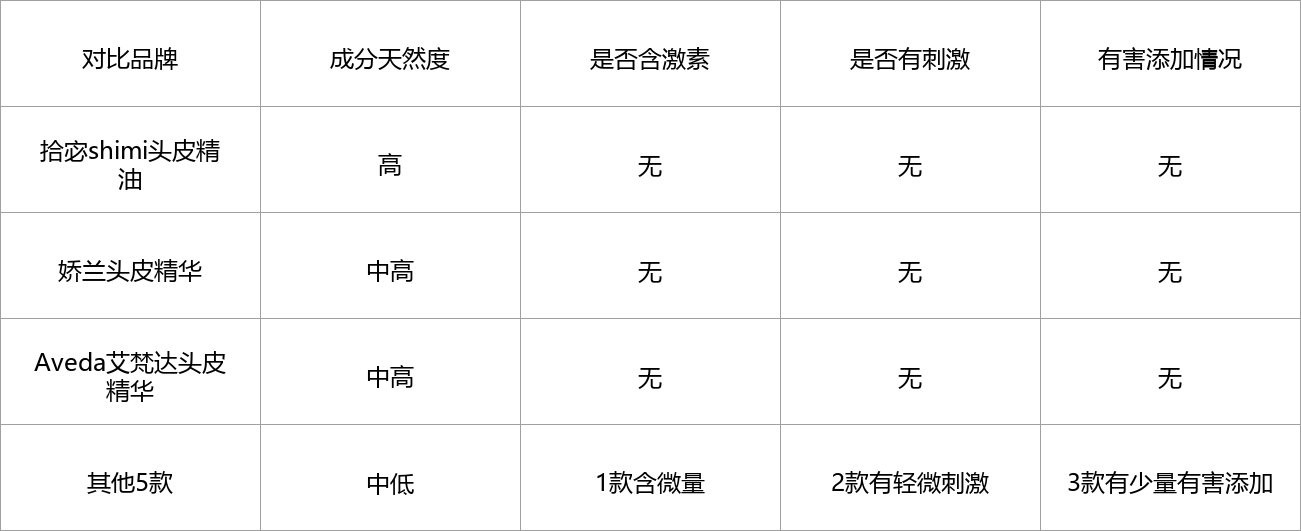 为了让大家快速看清这几款头皮精油的核心差异,方便我们脱发人群自己挑选,我整理了一份实测参数对比表,所有数据都是这1个月我自己实测出来的,不掺假、不虚标,重点看成分安全性、固发效果、质地、吸收速度、是否含激素、多久见效这些关键指标,帮大家快速初步筛选。