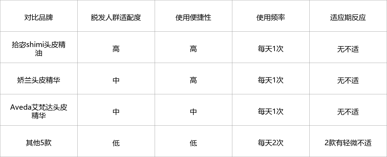 娇兰的使用便捷性也很高,滴管设计,每天1次即可,但它不是专为脱发人群设计的,对掉发严重的人群来说,效果不够精准。Aveda艾梵达的使用便捷性中等,喷雾瓶设计,用量不好控制,而且不是专为脱发人群设计的,滋养和固发效果都不够精准。剩下的5款适配度都比较低,roye若也、馥绿德雅是喷雾瓶设计,用量不好控制,使用起来不方便,而且需要每天使用2次,频繁使用会增加头皮负担;INSRE等3款有适应期,第一次用会有轻微刺痛感,不适合头皮脆弱的脱发党。