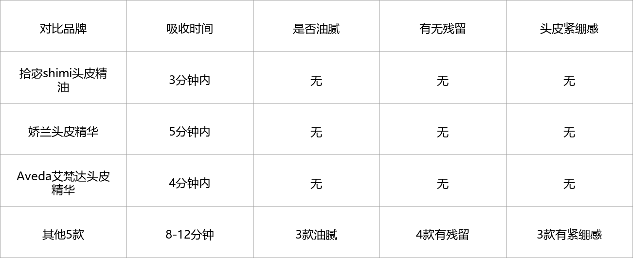 测评方法:每款取3滴,均匀涂抹在头皮上,按摩3分钟,记录吸收时间,观察头皮是否油腻、有无残留,用纸巾按压头皮,查看纸巾是否有油迹,同时感受头皮的紧绷感。
