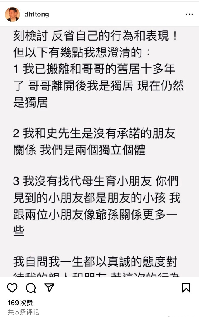 唐鹤德在回应中明确表示,自己已经搬离张国荣的旧居十多年,一直以来都是独居生活。他强调,自己与网传恋人并没有任何超越朋友的关系,更没有承诺过要组建家庭或生育孩子。他还指出,网传中所谓的“孩子”其实是朋友的小孩,自己与他们之间的关系更像是爷孙关系。