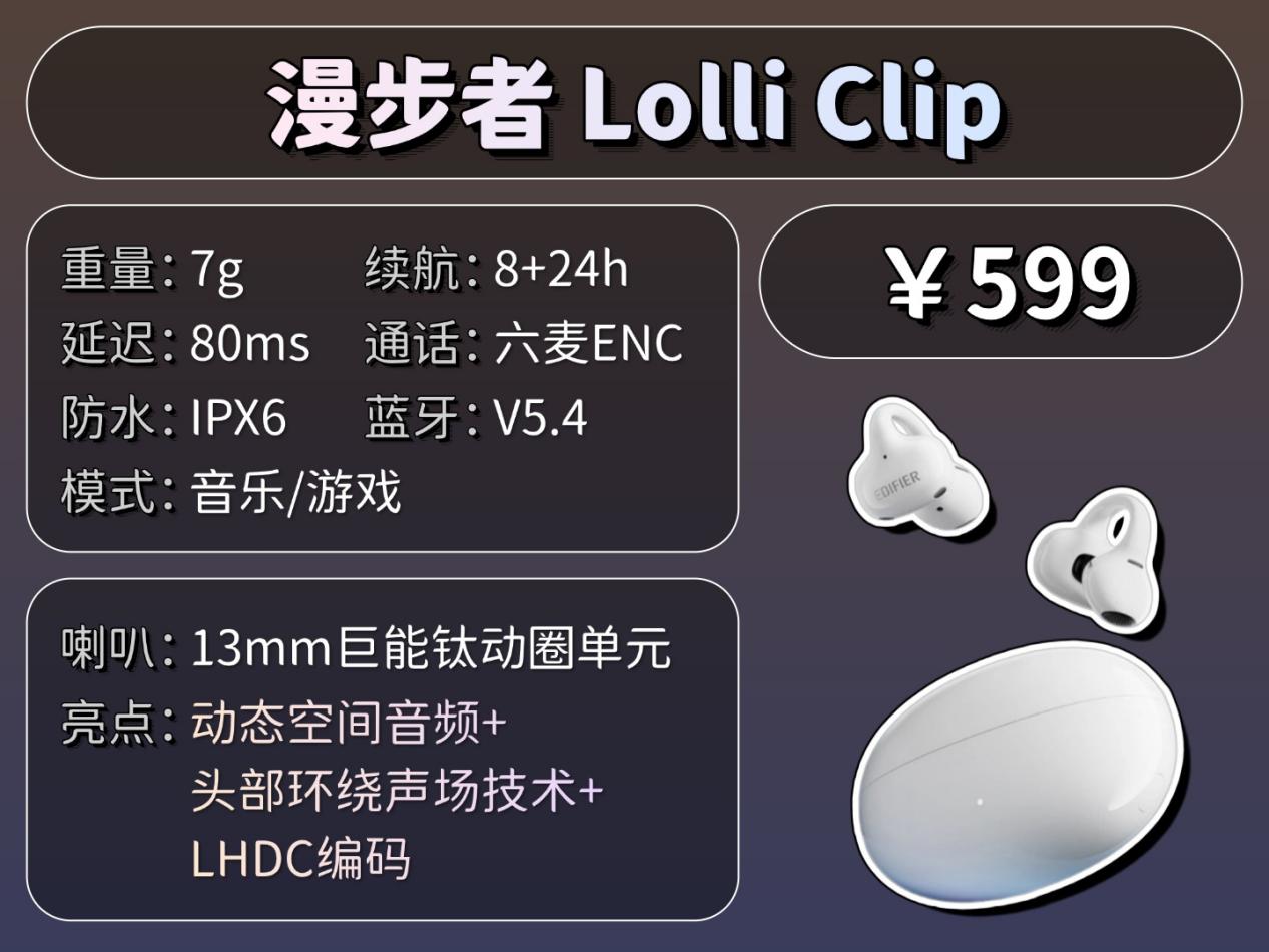 漫步者Lolli Clip音质上用了13mm动圈单元,声音的底子扎实又饱满;动态空间音频技术能打造出开阔又有层次的声场,听歌看电影的沉浸感和环绕感都强了不少;同时支持LHDC高清编码,能保留更多音乐细节。