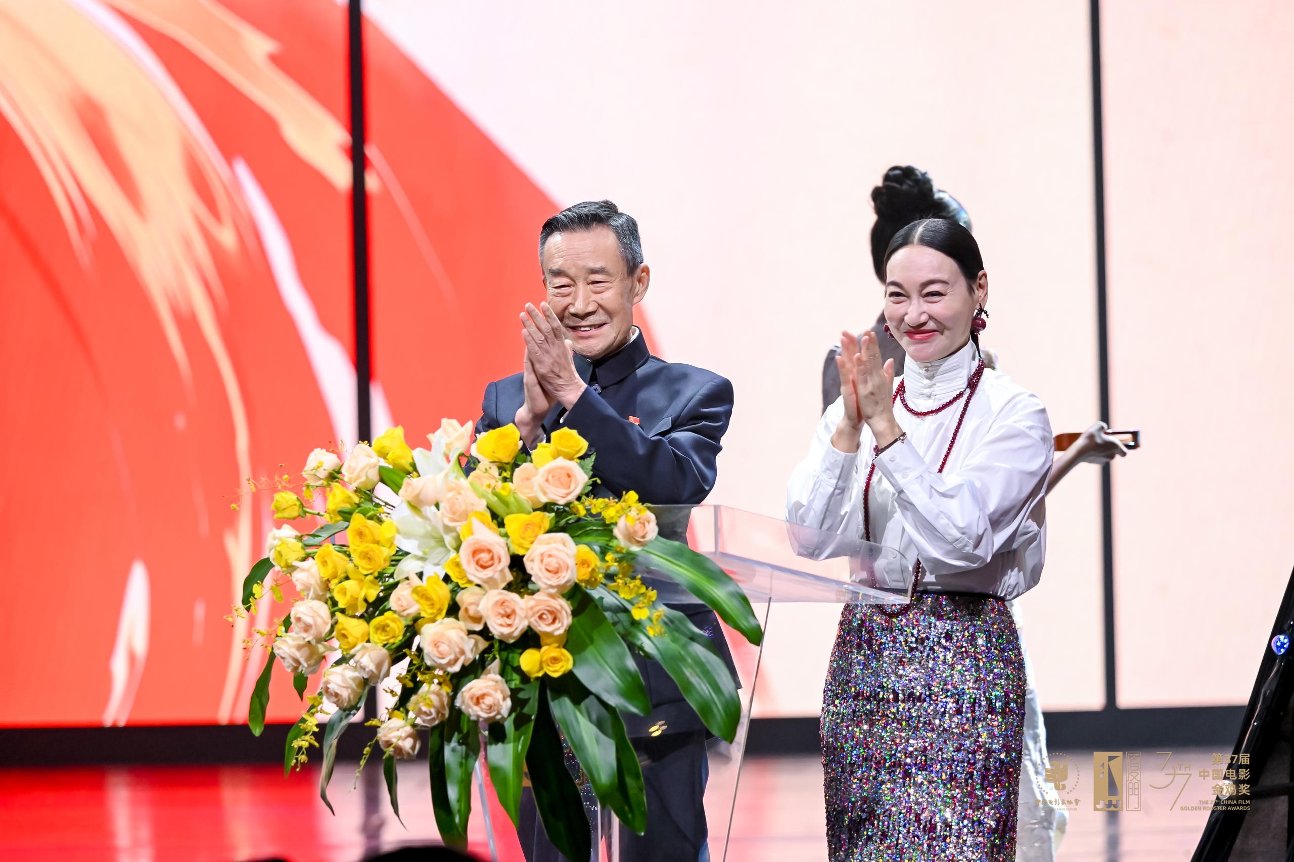 中国文联副主席、中国影协名誉主席李雪健和中国香港演员惠英红共同点亮金鸡