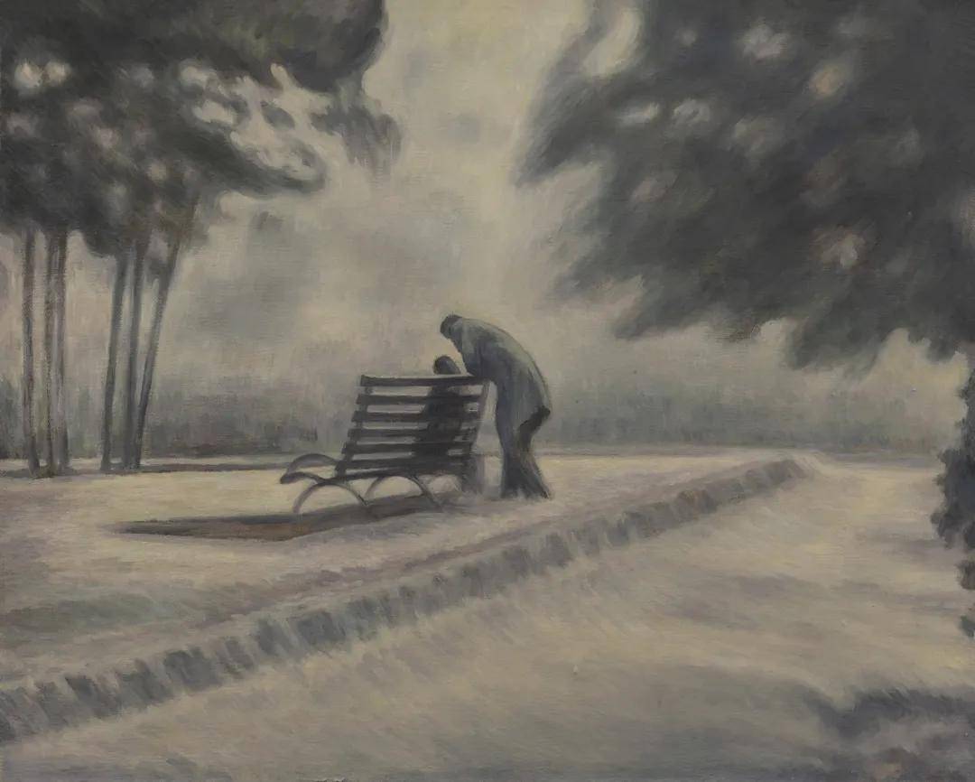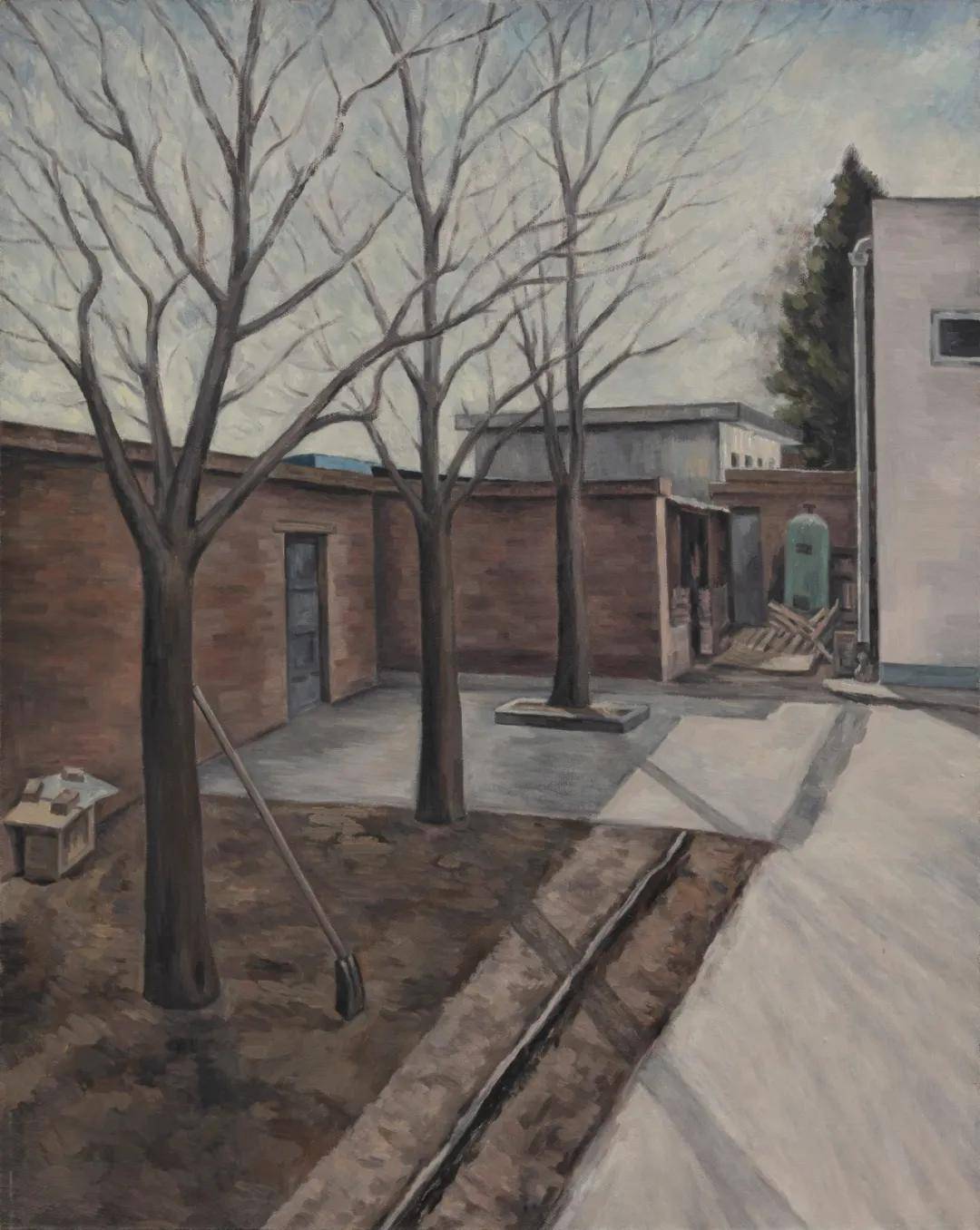 这个“再生”系列——包括《再生》组画和同展的几个作品——总体上贯穿着一种忧患的基调。我们看到的“再生”中不同年龄亲人的不同处境和样态,“落日”中角色身份不明的男女,“夕阳”下坐在画面边缘的老者和背后敞开的门与时钟,“午后”俯身面朝阴影下土地的老夫妇(?),树影下曾经同住“五号院”邻人和路人,远处长椅朦胧人形的“无题”,还有两幅时隔三年从静默到静默的的“自画像”等等,大多有一种悬置感 —— 年长者多处于边缘,仿佛是生命时长转换为空间格局 —— 使得原本二三维的架上绘画,具备了时空多维叠加的表现效能。 冯晓光是一位凡事都有态度的艺术家,他创造的“再生”,不仅是对人生起承转合、生老病死的洞察和感悟,更是表达一种对生命和世间万物盛衰枯荣、悲欢离合的特定态度。