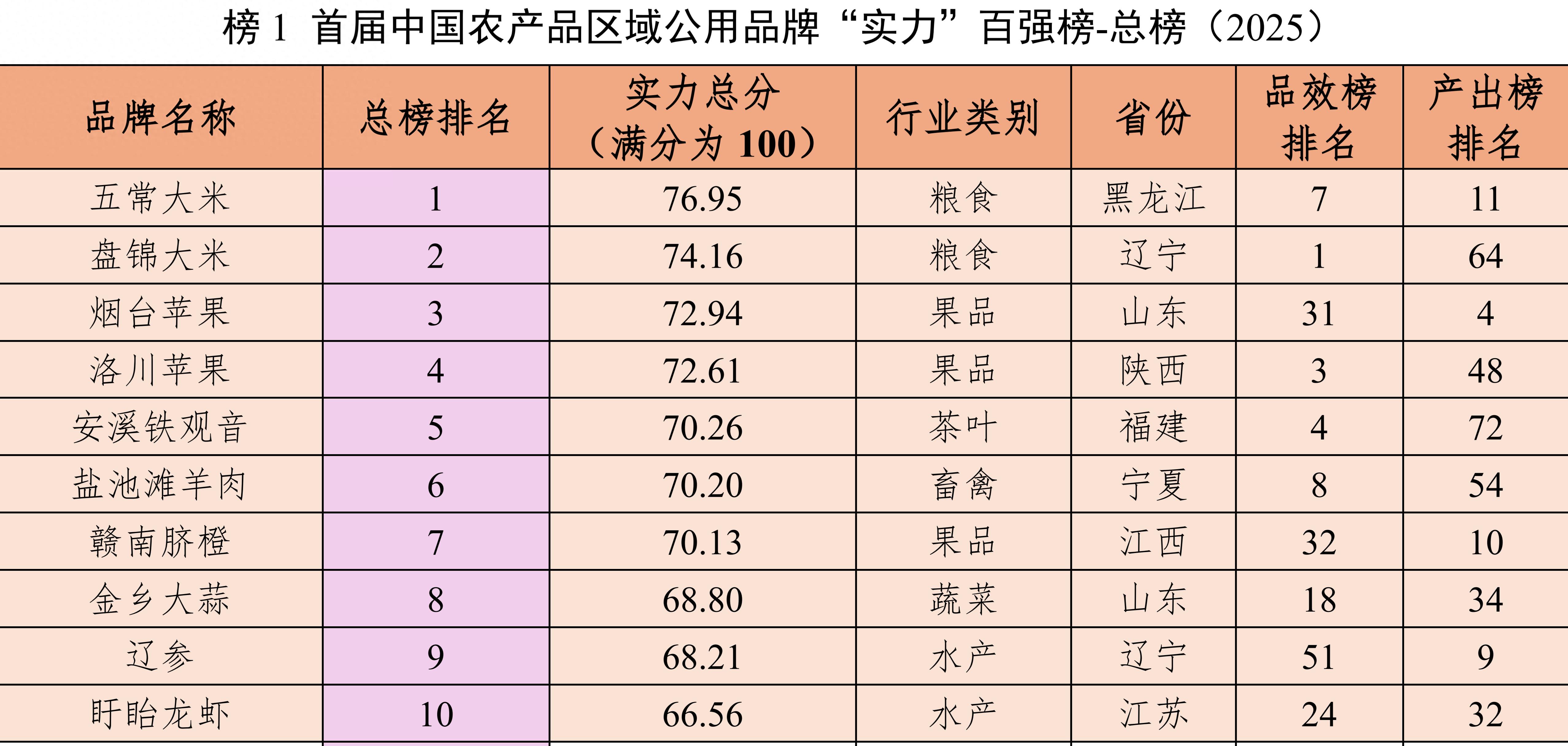 中国农产品区域公用品牌“实力”百强榜(2025)前十名。 江南大学供图