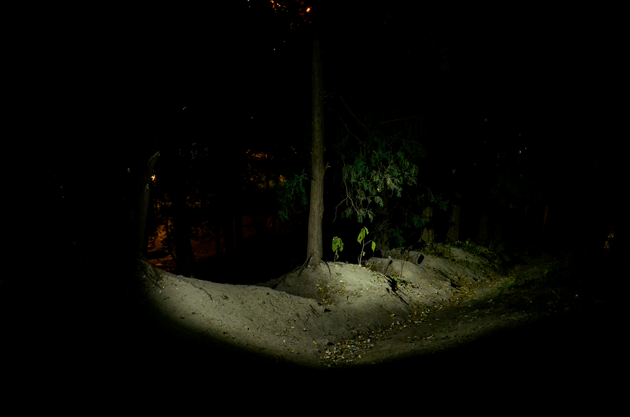 中心最大光强12400坎德拉,有效照明距离230米,作为EDC手电来讲,效果非常好,而且还能同时开启正中的绿色激光定点准星(下图中沿着光柱最前方路的尽头是绿色激光单),看得清、定位准。