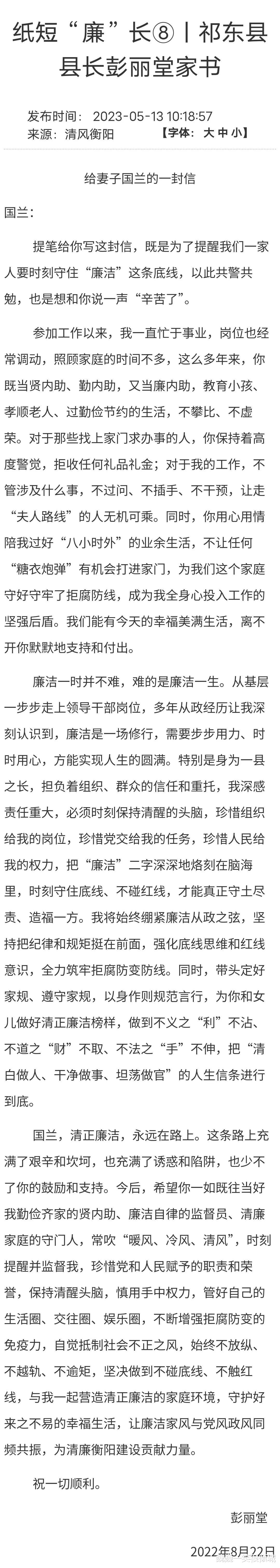 值得注意的是,这个祁东县县长彭丽堂还是一个双面人的,台前一套背后一套的,为什么这么多说呢?在网上可以找到这个祁东县县长彭丽堂曾经写给妻子的一封家书,这一位县长非常有文采,写的上面的内容令人感到不已啊。