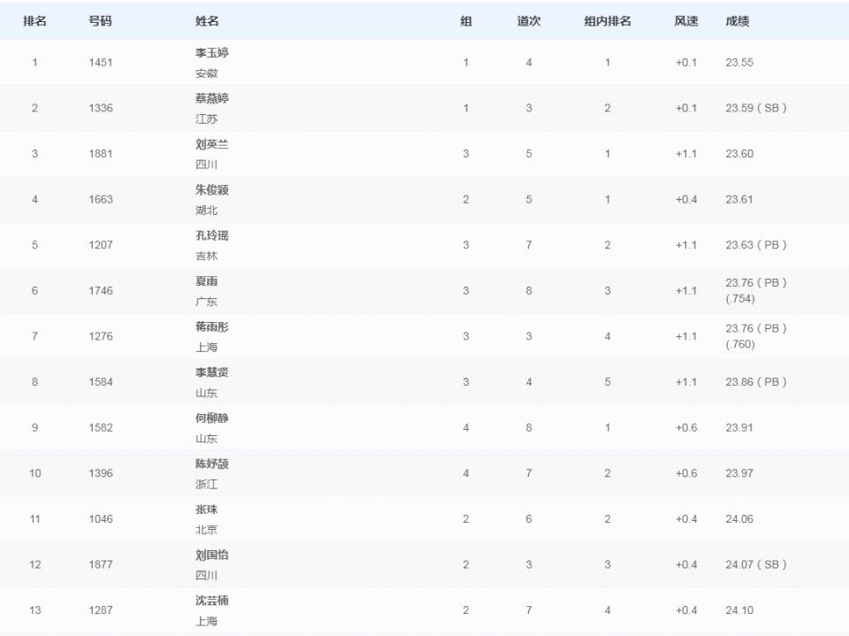 今天的本场女子200米预赛,第一小组安徽的李玉婷以23秒55获得第一,第二组湖北的朱俊颖以23秒61获得小组头名。第三组四川的刘英兰以23秒60获得第一,吉林的孔玲瑶23秒63创PB排名小组第二。