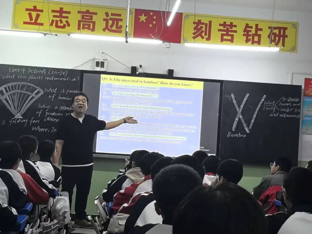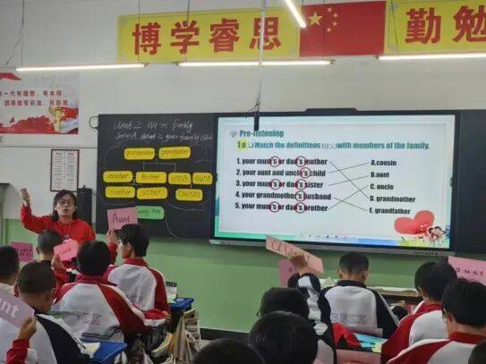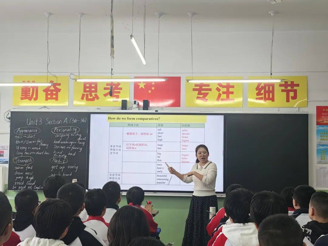 数学课堂变身“思维健身房”,教师以阶梯式问题为引,带领学生攀登逻辑高峰,通过测量、小组讨论等多种形式,将抽象的几何定理变得直观易懂。学生们踊跃参与其中,在亲手实践的过程中,原本抽象的数学知识变得直观可感,尽显课堂的蓬勃生机与活力。英语----语言为翼,文化翱翔