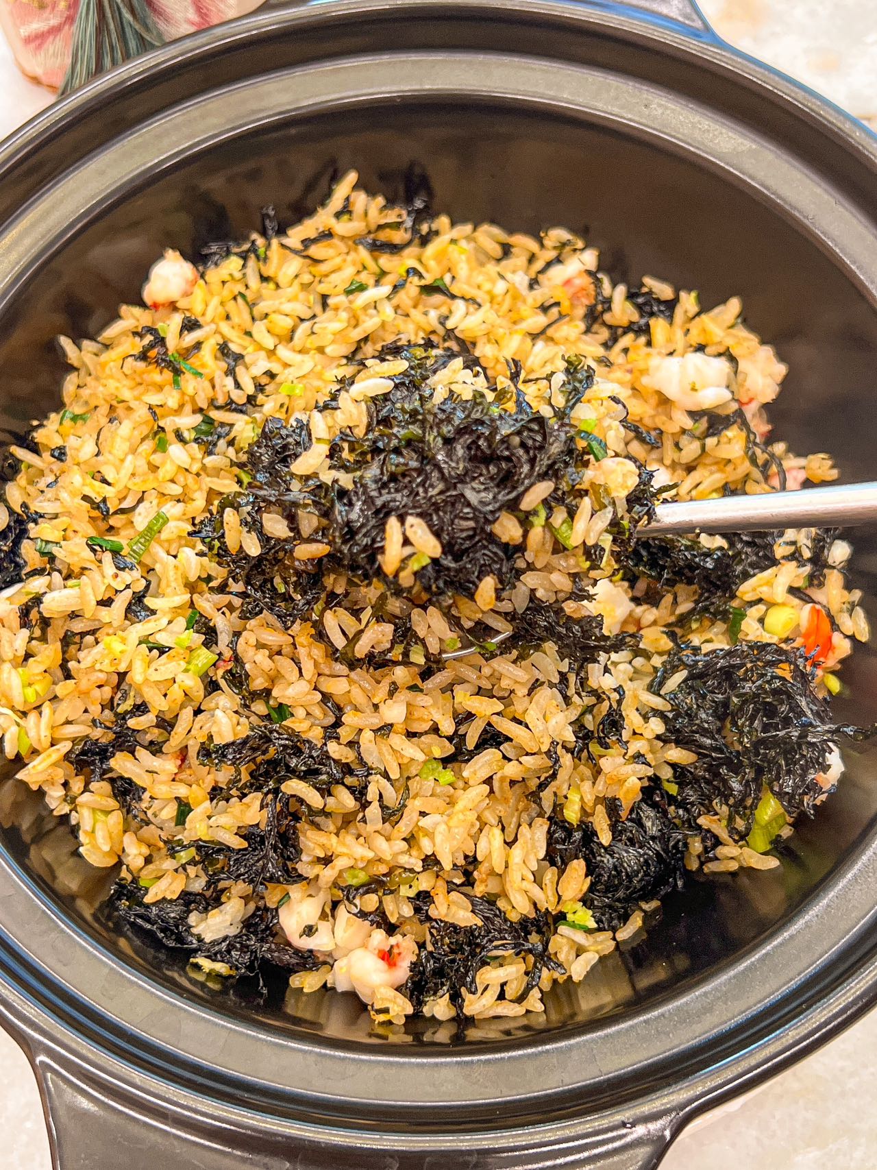在峪园,头水紫菜被主厨赋予了多样化的灵魂。最简单的做法——头水紫菜酥,将紫菜低温轻炸,撒上细盐与芝麻,入口即化,酥脆中溢出海洋的鲜香,是绝佳的开胃小食。而头水紫菜海鲜炒饭则更具创意,米饭粒粒分明,裹着紫菜的深紫,虾仁、干贝的鲜甜与紫菜的独特风味交织,一口下去,山海之味尽在舌尖。