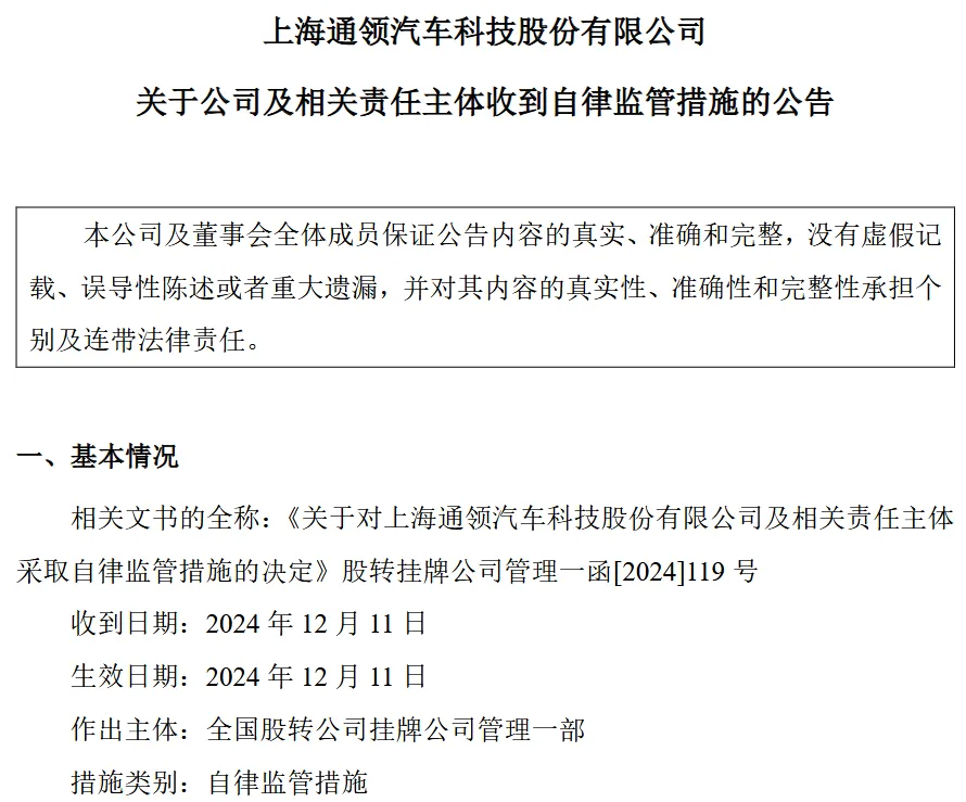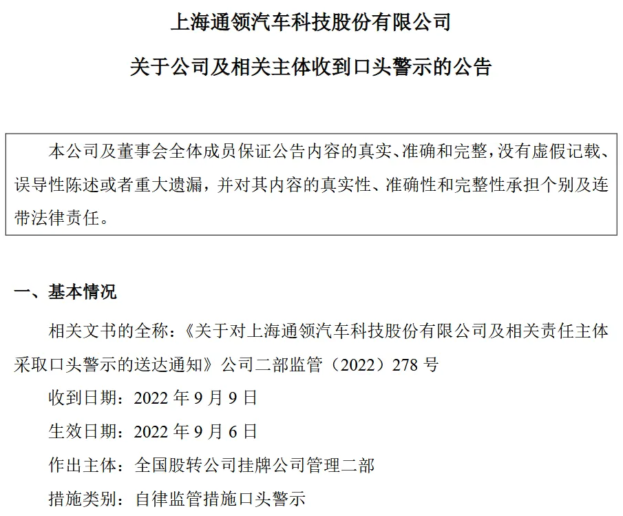 时间回溯至2022年,全国股转公司于当年9月6日出具《关于对上海通领汽车科技股份有限公司及相关责任主体采取口头警示的送达通知》(公司二部监管[2022]278号),因签署辅导协议以及向证监局报送辅导材料未及时披露事项,全国股转公司对通领科技及公司董事长项建武、董事会秘书彭某平进行口头警示。