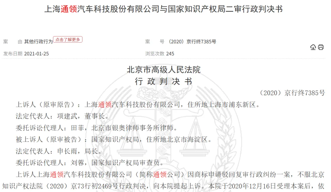 通领科技曾就第30827425号“TONGLING”商标的注册申请展开漫长诉讼,该商标指定使用于第12类汽车内饰件等商品,但国家知识产权局以违反《中华人民共和国商标法》第三十条为由,认为其与江苏通立特实业有限公司的第7294929号引证商标构成近似,因而驳回了申请。通领科技对此决定不服,先是向北京知识产权法院提起诉讼,但原审判决驳回了其诉讼请求。随后,公司向北京市高级人民法院提起上诉,二审审理过程中,关键转折出现:引证商标已被全部注销,诉争商标注册的在先权利障碍因此消失。最终,北京市高级人民法院于2021年1月15日作出终审判决,撤销了原审判决及国家知识产权局的相关驳回复审决定书,并判令国家知识产权局就该商标驳回复审申请重新作出决定。