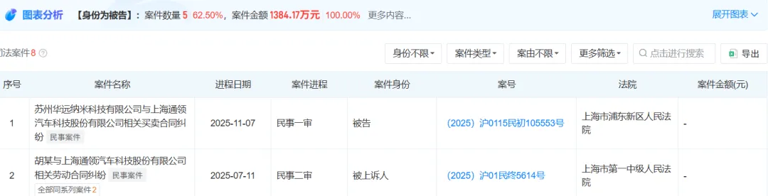 然而,通领科技的法律挑战并未止步于此。根据天眼查的信息,公司在2025年面临两起新的司法诉讼,进一步凸显其陷入民事与劳动纠纷的困境。其中一起为买卖合同纠纷,案号为(2025)沪0115民初105553号,由苏州华远纳米科技有限公司提起,该案定于2025年11月7日在上海市浦东新区人民法院西漕第十八法庭开庭审理。另一起则是劳动合同纠纷,案号为(2025)沪01民终5614号,已进入二审程序,上诉人为胡某,被上诉人为通领科技,于2025年7月11日在上海市第一中级人民法院审理。但值得注意的是,中国裁判文书网的搜索结果并未显示这两起案件,这或许反映了信息公开的延迟或差异。