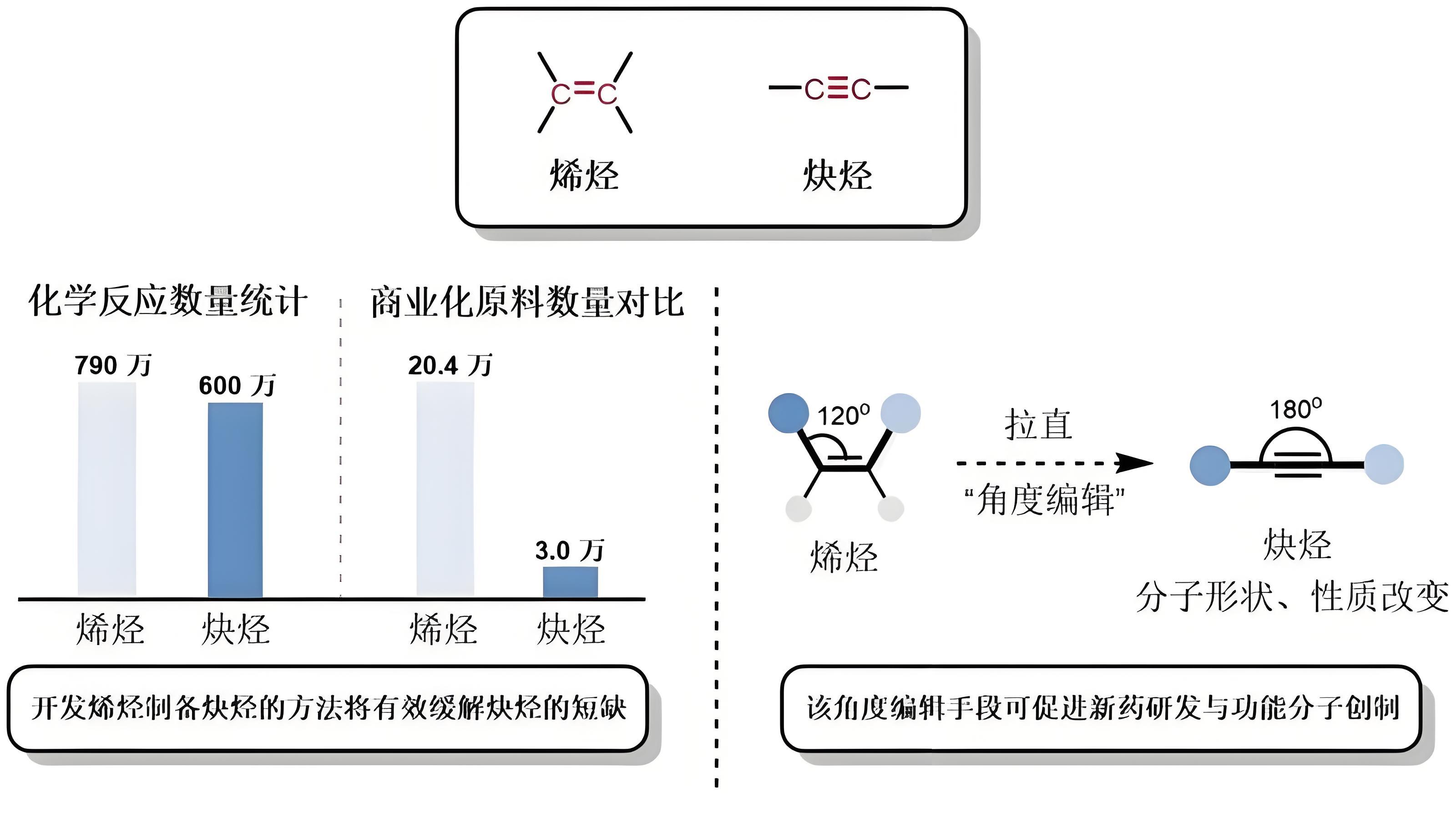 要知道,烯烃和炔烃可是现代合成化学的“左右手”。烯烃来源广、价格低,是化工界的“平价大米”;而炔烃凭借独特的碳碳三键,能搭建出各种功能分子,是新药和新材料里不可或缺的“黄金骨架”。过去,想把“平价大米”升级成“黄金骨架”,难如登天。这一步若打通,就等于直接连通了从“廉价原料”到“高端产品”的任督二脉。