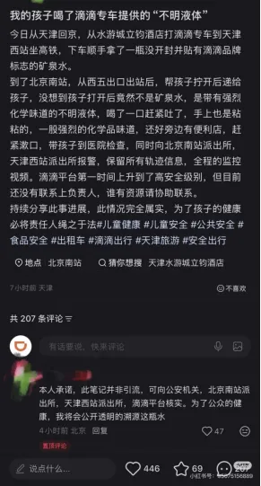 近日,有网友在社交媒体发文,自己从天津回北京,期间于水游城立钧酒店打滴滴专车到天津西站坐高铁,下车时顺手拿了一瓶没开封并贴有滴滴品牌标志的矿泉水。在北京南站出站后,该网友帮孩子拧开从滴滴专车上带下来的矿泉水,却发现瓶中是带有强烈化学味道的不明液体,“喝了一口赶紧吐了,手上也是黏黏的,一股强烈的化学品味道”。
