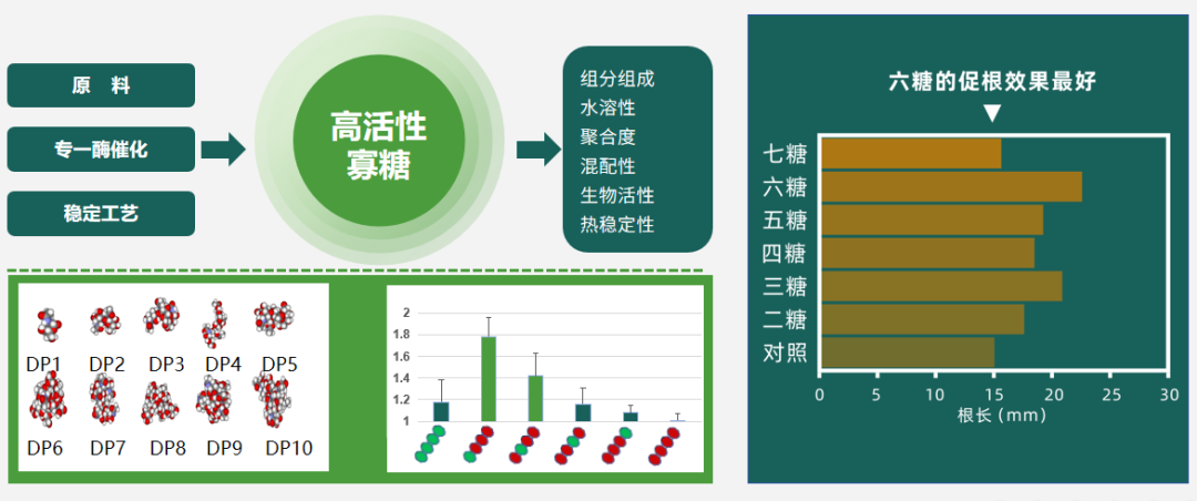 判断褐藻寡糖的优劣重点要看生物活性,相较于海藻精和海藻酸,褐藻寡糖的生物活性是提取褐藻中活性最高的片段,试验数据表明,不同聚合度的褐藻寡糖在促进植物根系生长上的效果不尽相同。结构决定功能--不同结构的褐藻寡糖生物活性差异巨大,经过反复的实验证明1糖2糖活性最低,4糖5糖活性最高,6糖的生根效果最好。