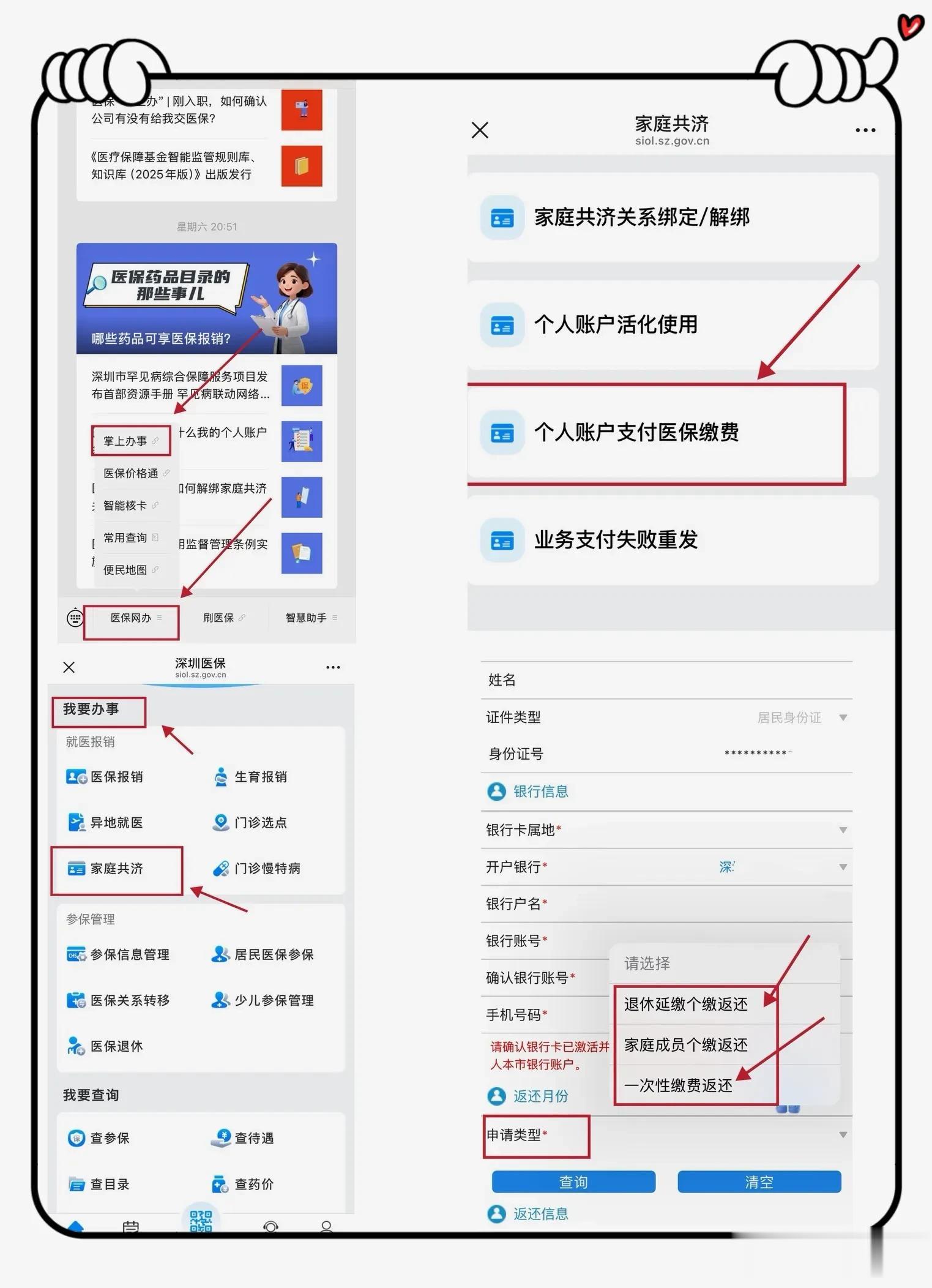 微信关注“深圳医保”服务号,左下角找到“医保网办”,点开找到“掌上办事”,刷脸登录后,在“我要办事”下面找到“家庭共济”,点开并找到“个人账户支付医保缴费”,继续点开并点击“申请类型”,就会看到三个选项: