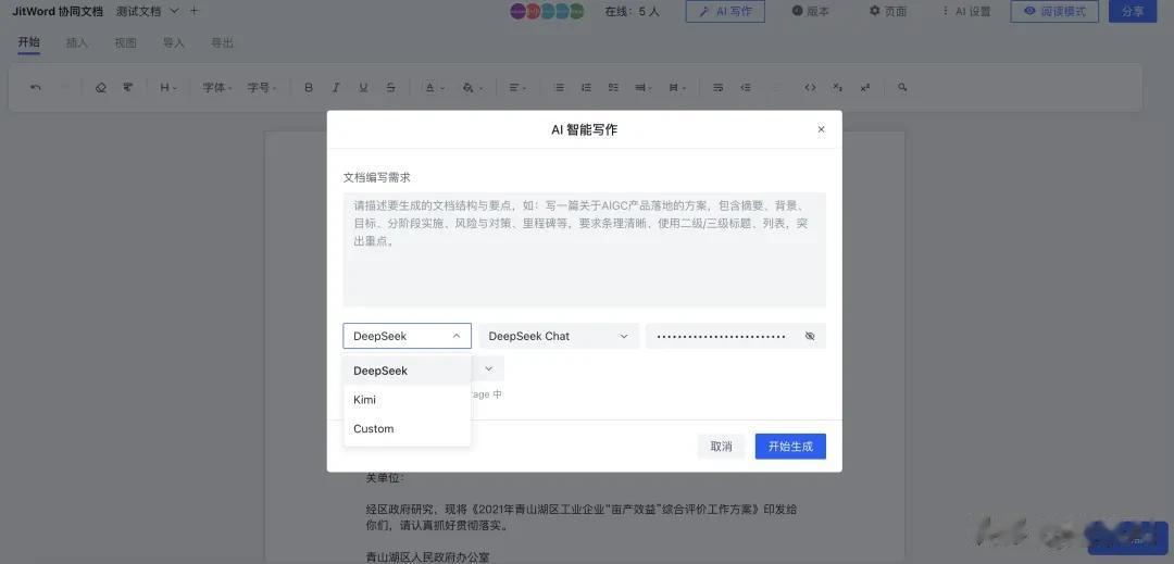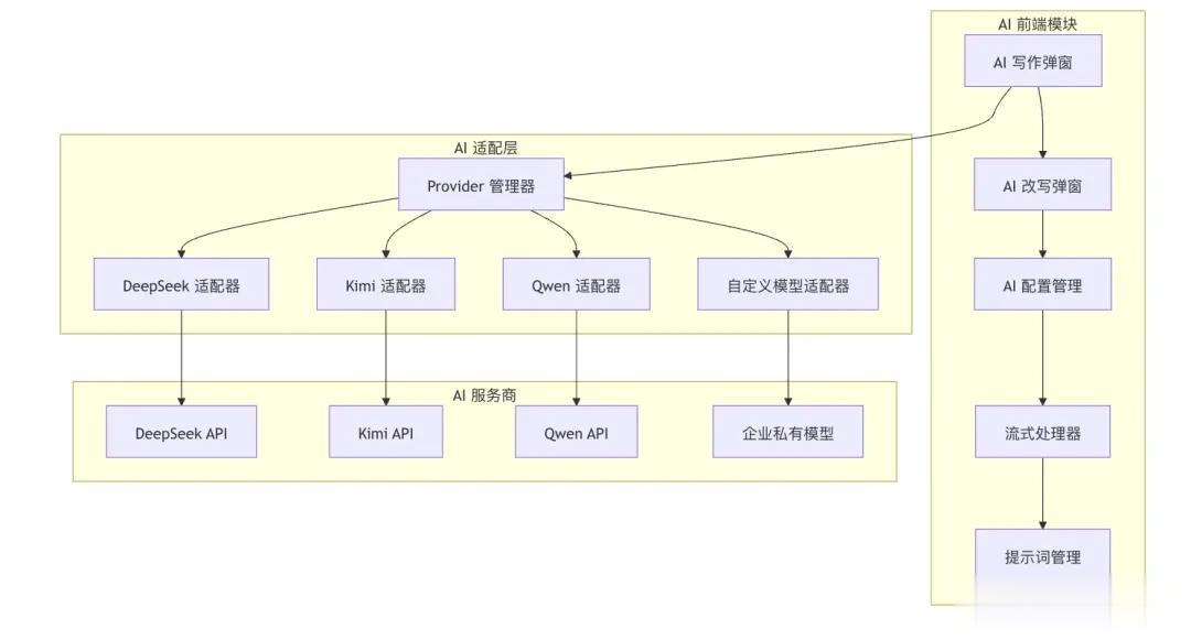 智能生成根据主题和大纲快速生成高质量文档内容智能改写一键改写、润色、扩展现有内容,支持多种写作风格智能总结自动提取文档要点和摘要,生成执行摘要多模型支持深度集成 DeepSeek、Kimi、Qwen 等主流大模型企业私有化支持接入企业私有化 AI 模型和自定义提示词流式生成实时流式输出,边生成边显示,提升用户体验上下文理解基于文档上下文的智能内容生成和建议上下文理解可定制化的提示词工程多语言支持支持中英文等多语言的智能写作和翻译✏️ 专业文档编辑能力