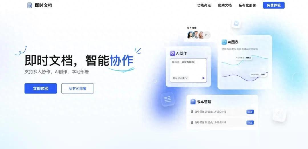 极低延迟10-30ms 超低协作延迟,媲美本地编辑体验高并发支持支持 100+ 人高频协同编辑,500+ 人流畅协作企业级扩展系统可支持 10万+ 级并发用户协同光标显示实时显示其他协作者的光标位置和选择区域智能冲突解决自动处理编辑冲突,确保数据一致性断线重连机制网络中断后自动重连并同步最新状态协作状态推送实时推送用户上线/下线和编辑状态 AI 全程接管创作