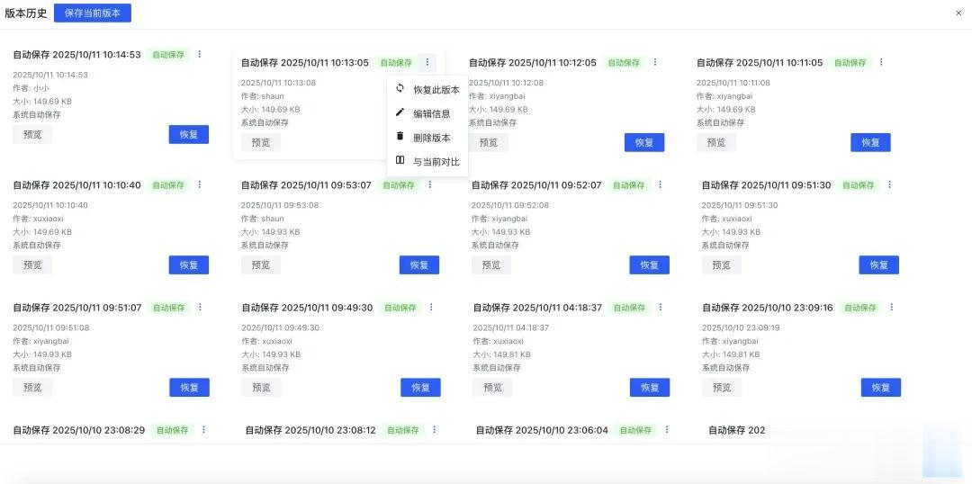 智能自动保存系统按预设间隔智能创建版本快照手动版本创建用户可随时创建重要版本节点,添加版本说明可视化版本对比直观对比不同版本间的差异,支持并排查看一键版本恢复快速恢复到任意历史版本,支持恢复确认版本分支管理支持创建和合并文档分支,适用于复杂协作场景完整操作日志支持记录所有编辑操作历史,支持操作回放版本元数据丰富的版本信息,包括作者、时间、变更统计等版本权限控制支持拓展细粒度的版本操作权限管理 多格式兼容无缝对接现有办公生态,支持多种文件格式: